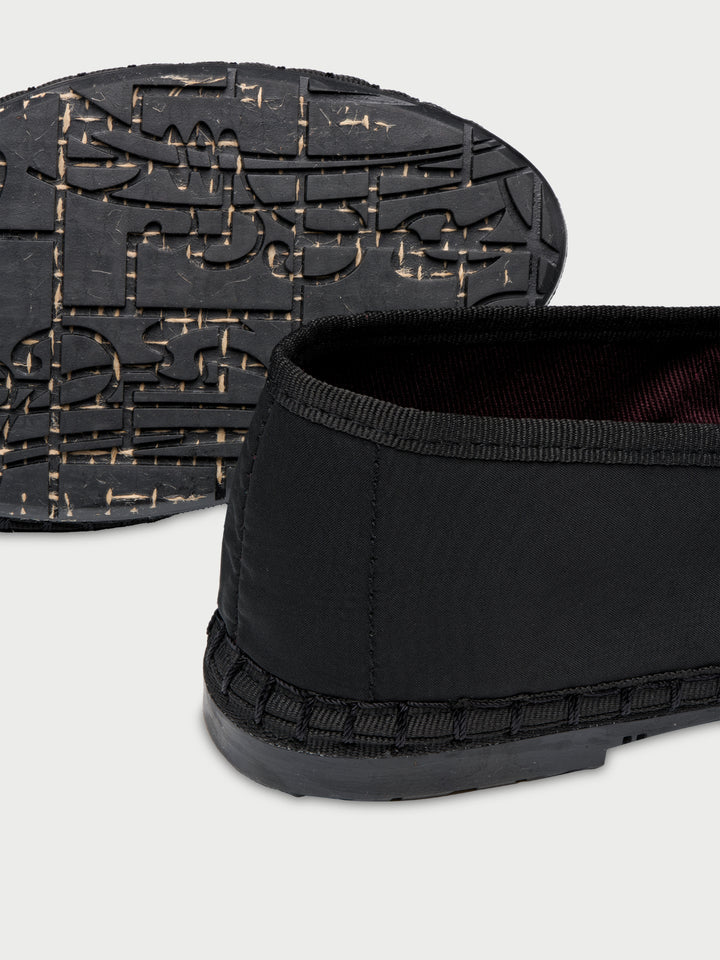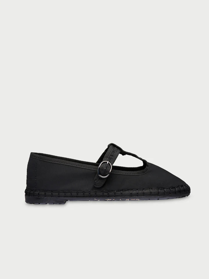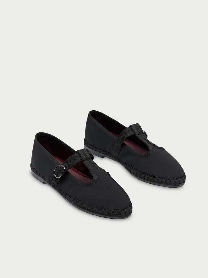 Una versión refinada de la clásica Mary Jane de nylon en negro con ribete negro y cierre de hebilla.