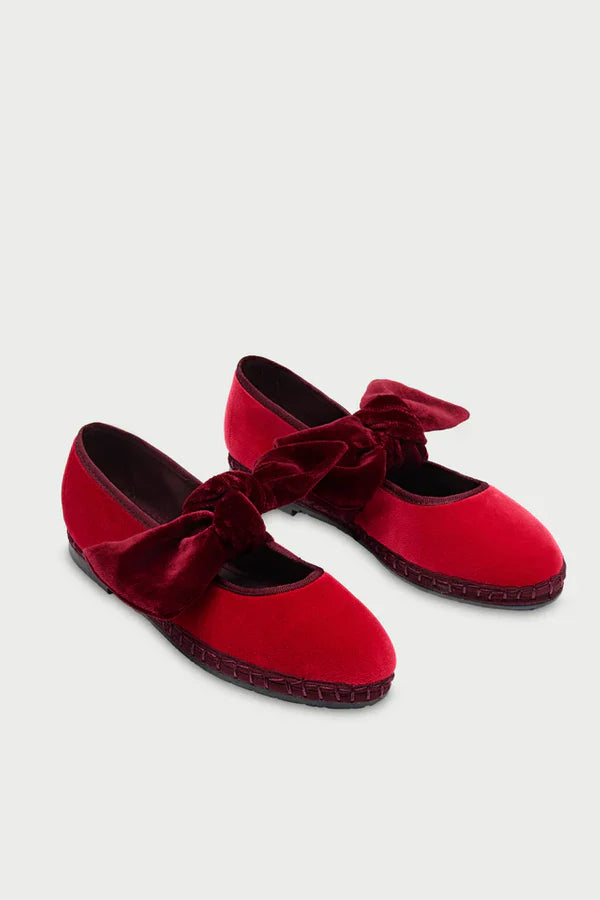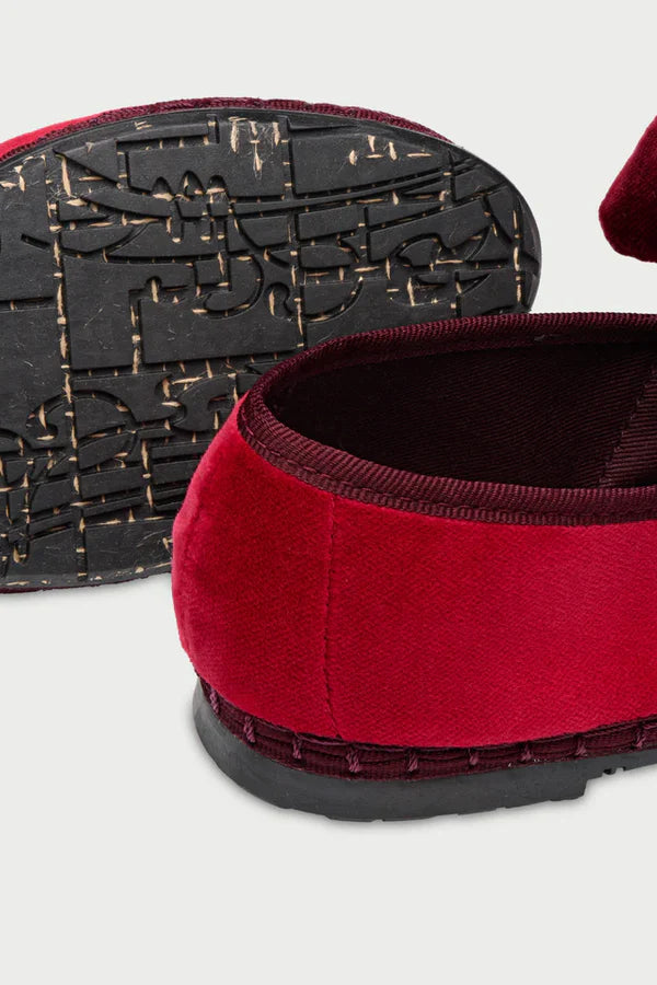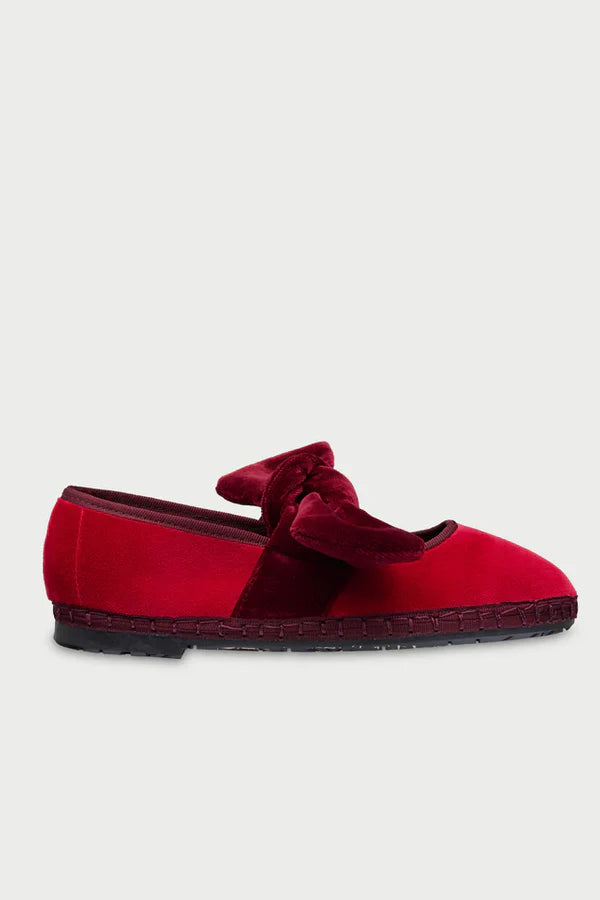 Zapatilla de terciopelo con ribete y lazo como cierre.