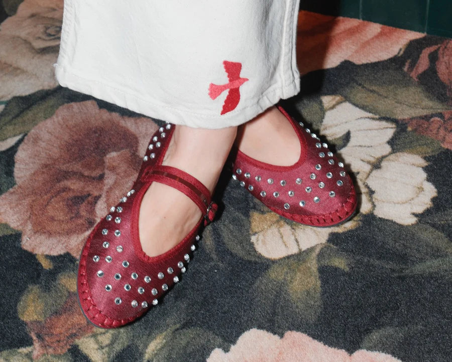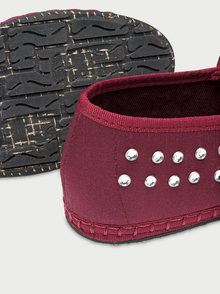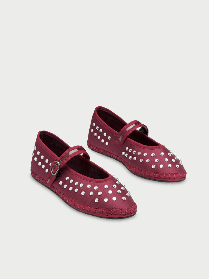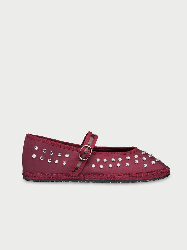 Bailarina de seda con escote en V en color burdeos con ribetes en color burdeos y tachuelas de cristal. Acordonado con una correa de charol y cierre de hebilla.