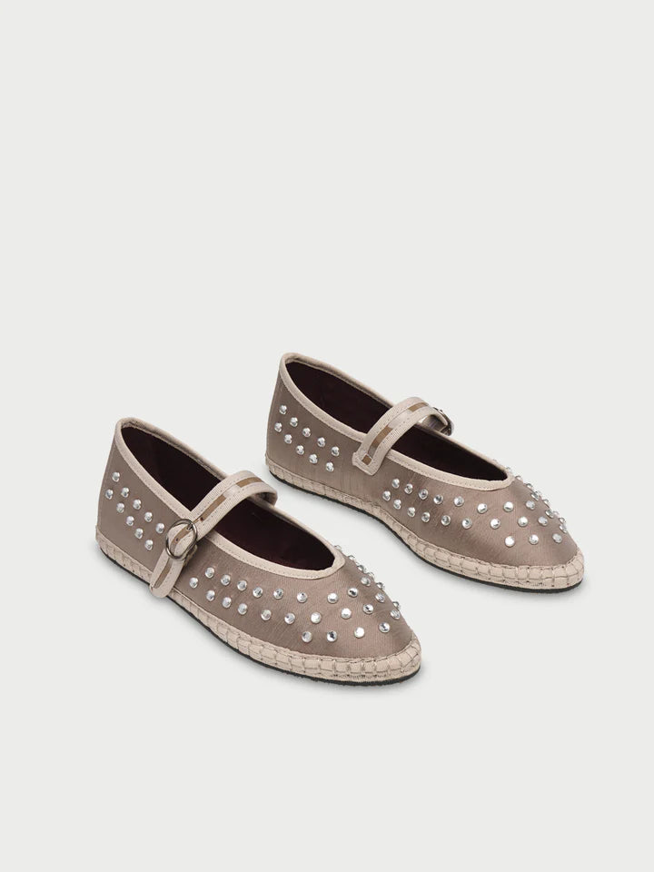 Bailarina de seda con escote en V en color marrón claro con ribetes en beige claro y tachuelas de cristal. Acordonado con una correa de charol y cierre de hebilla.