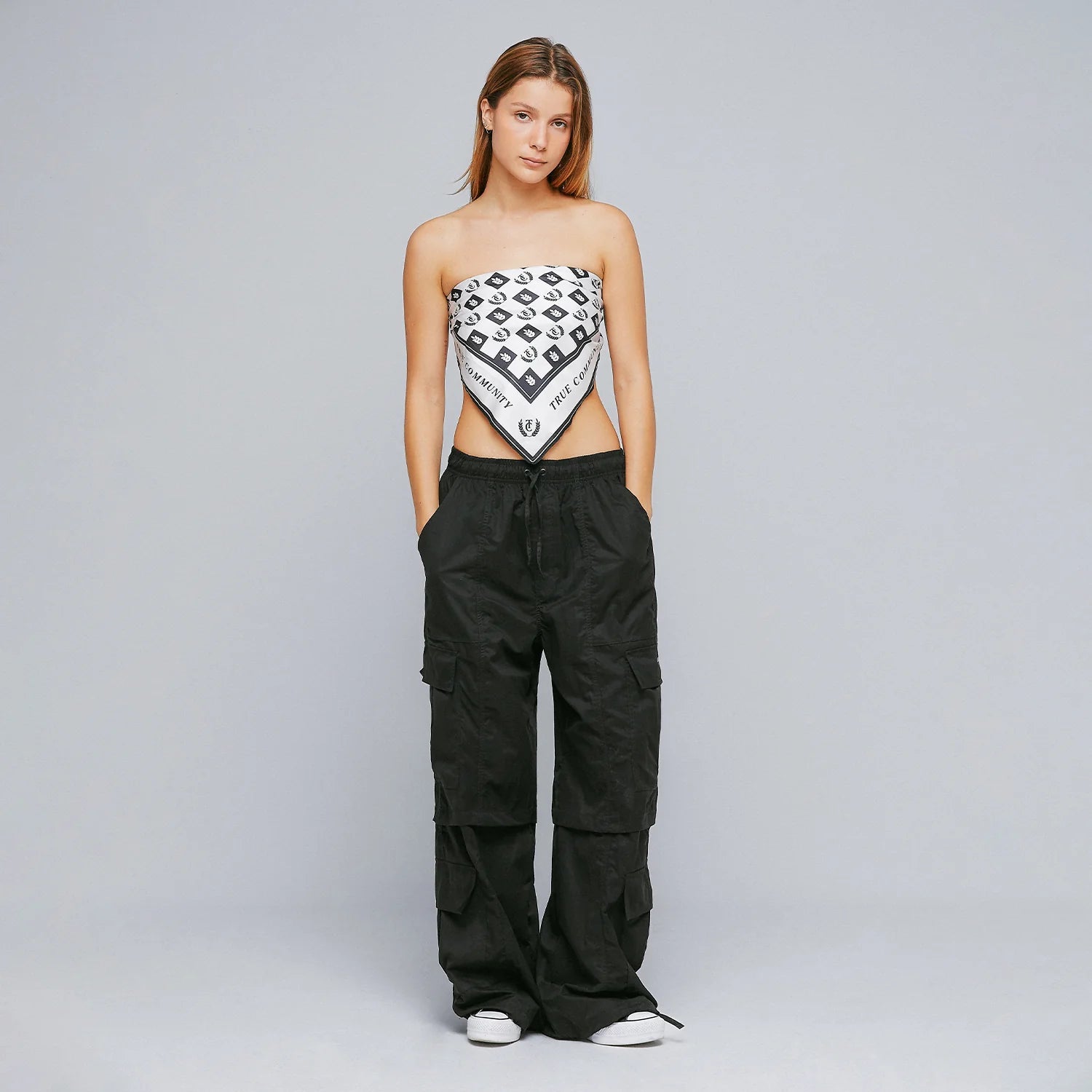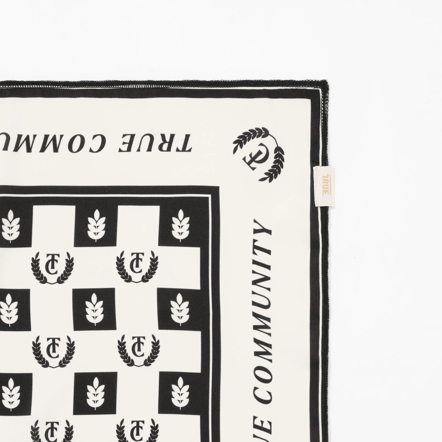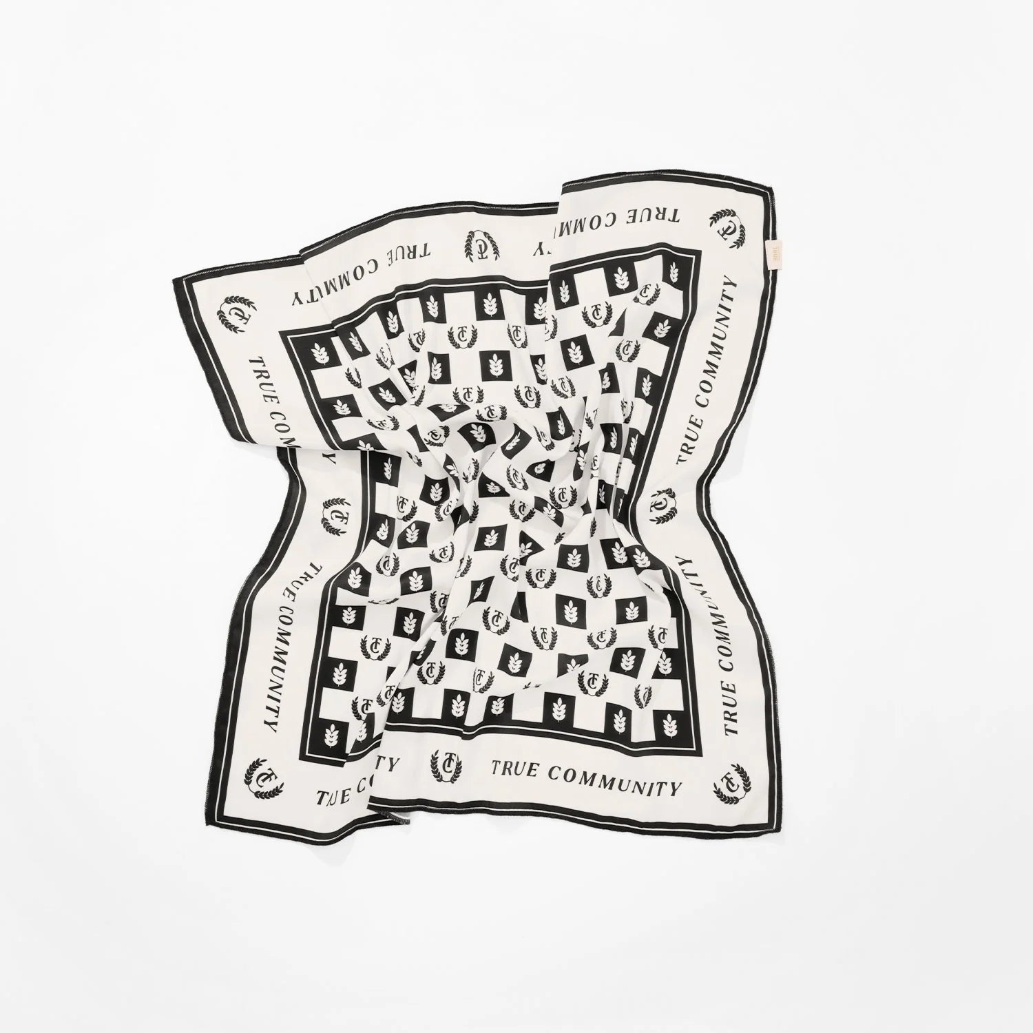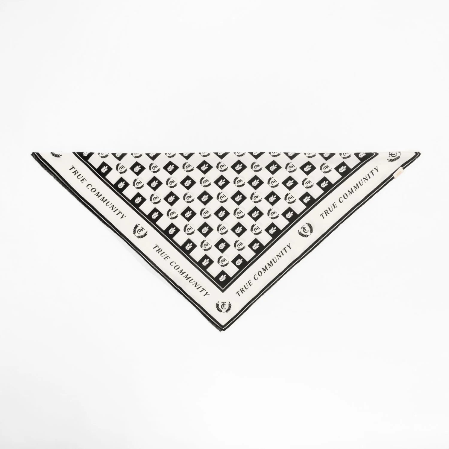 Bandana con diseño a cuadros y un logotipo sublimado en cada lado sobre un fondo crema.