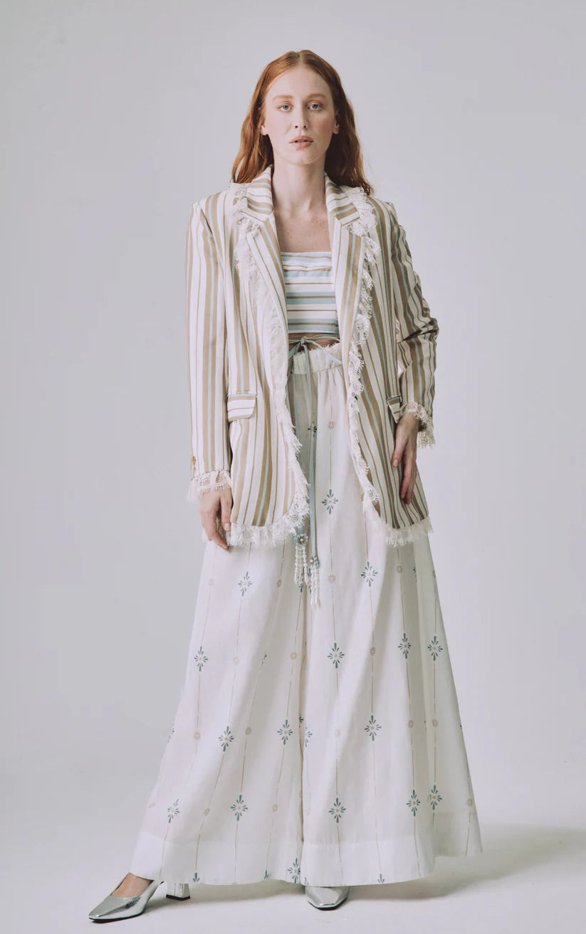 El blazer tiene un corte relajado, ligeramente oversize. Se caracteriza por un patrón de rayas verticales en tonos naturales y tierra, posiblemente beige, crema y verde oliva, lo que le confiere un aspecto sofisticado pero casual. Una característica distintiva son los bordes deshilachados o con flecos a lo largo de las solapas, los puños y el dobladillo, añadiendo un toque bohemio o deconstruido. Parece estar desabrochado, mostrando un top tipo bandeau debajo. La tela se ve ligera y adecuada para climas cálidos, lo que es consistente con un blazer de verano.