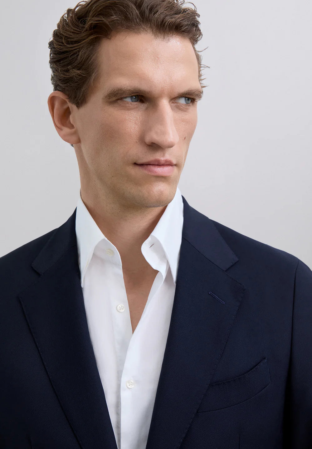 Americana lisa clásica. Confeccionada en tejido 100% lana. Corte Regular Fit semi armada. Cuello con solapas de muesca. Cierre con botones. Bolsillos con solapa cerillero. Manga larga terminada en puño con botones practicables.