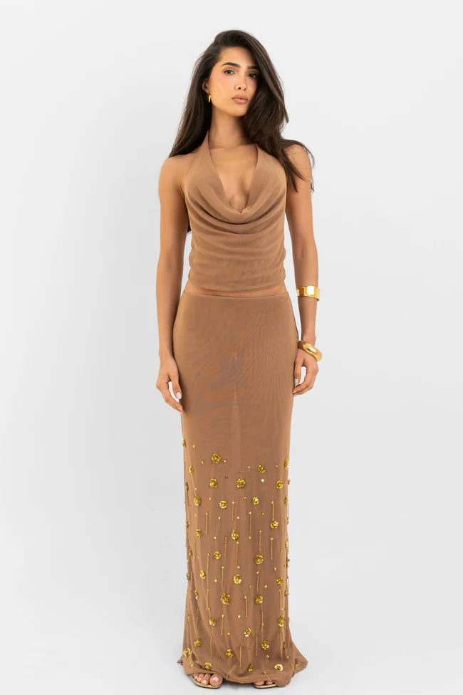 Top estilo halter con escote pronunciado y tiras para anudar en la espalda.