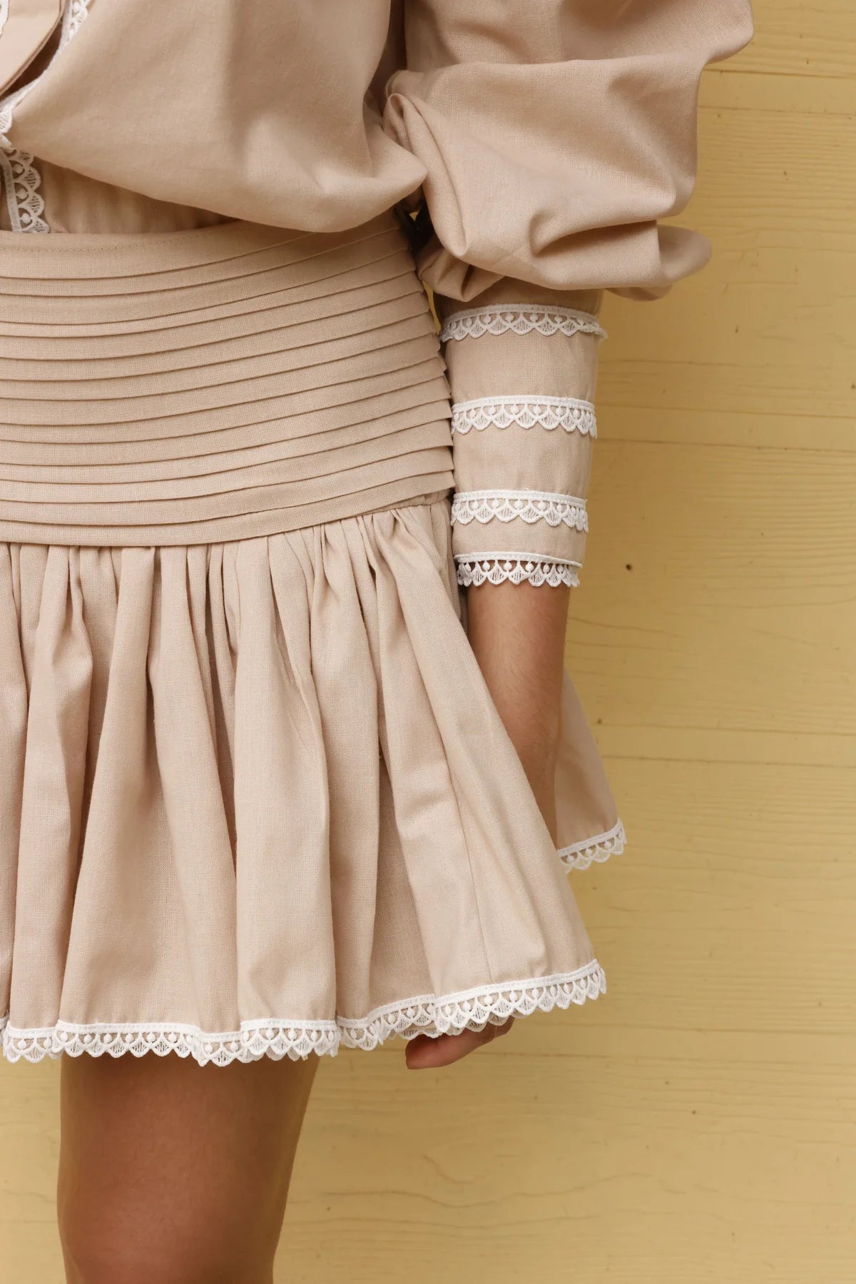 Camisa manga larga, fusionada con encajes y detalles románticos. Los encajes bordados pueden variar de diseño según disponibilidad, pero conservan la calidad y tamaño.