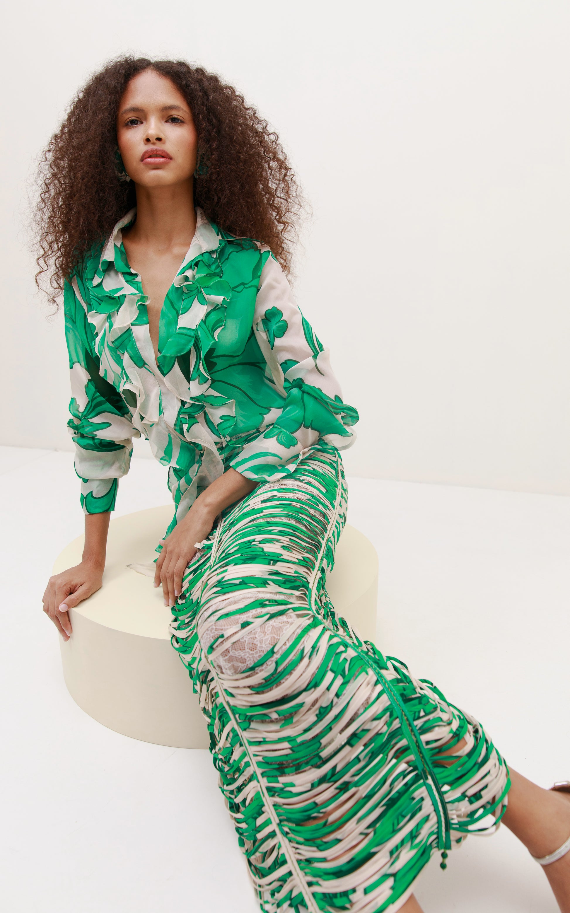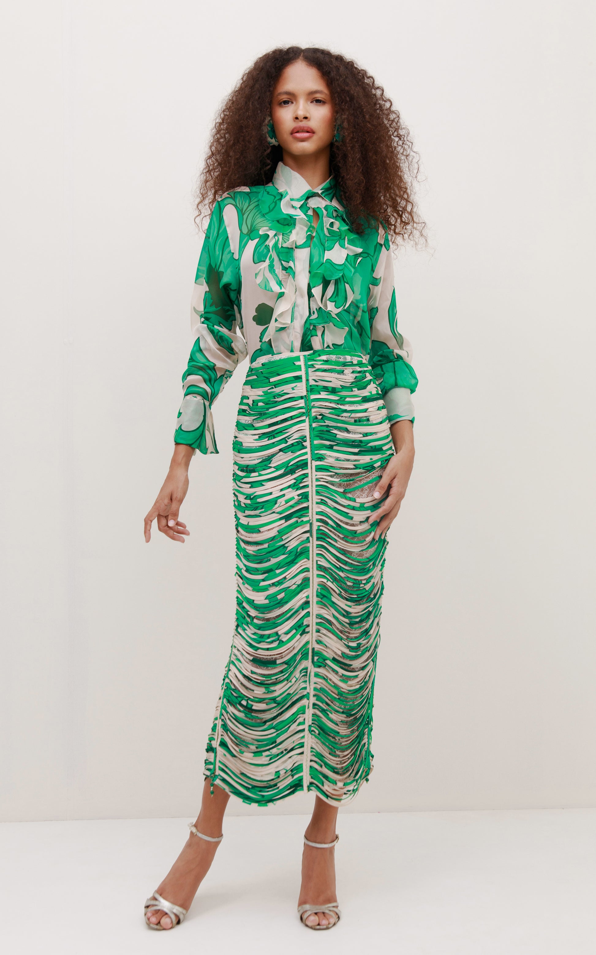 Blusa manga larga y cuello alto. Presenta un vibrante estampado floral en tonos de verde, la blusa tiene volantes o fruncidos decorativos en la parte delantera, específicamente alrededor del escote y a lo largo de la botonera, lo que le da un toque romántico y femenino. mangas largas, y tejido ligero y fluido de seda, lo que le otorga una caída elegante.