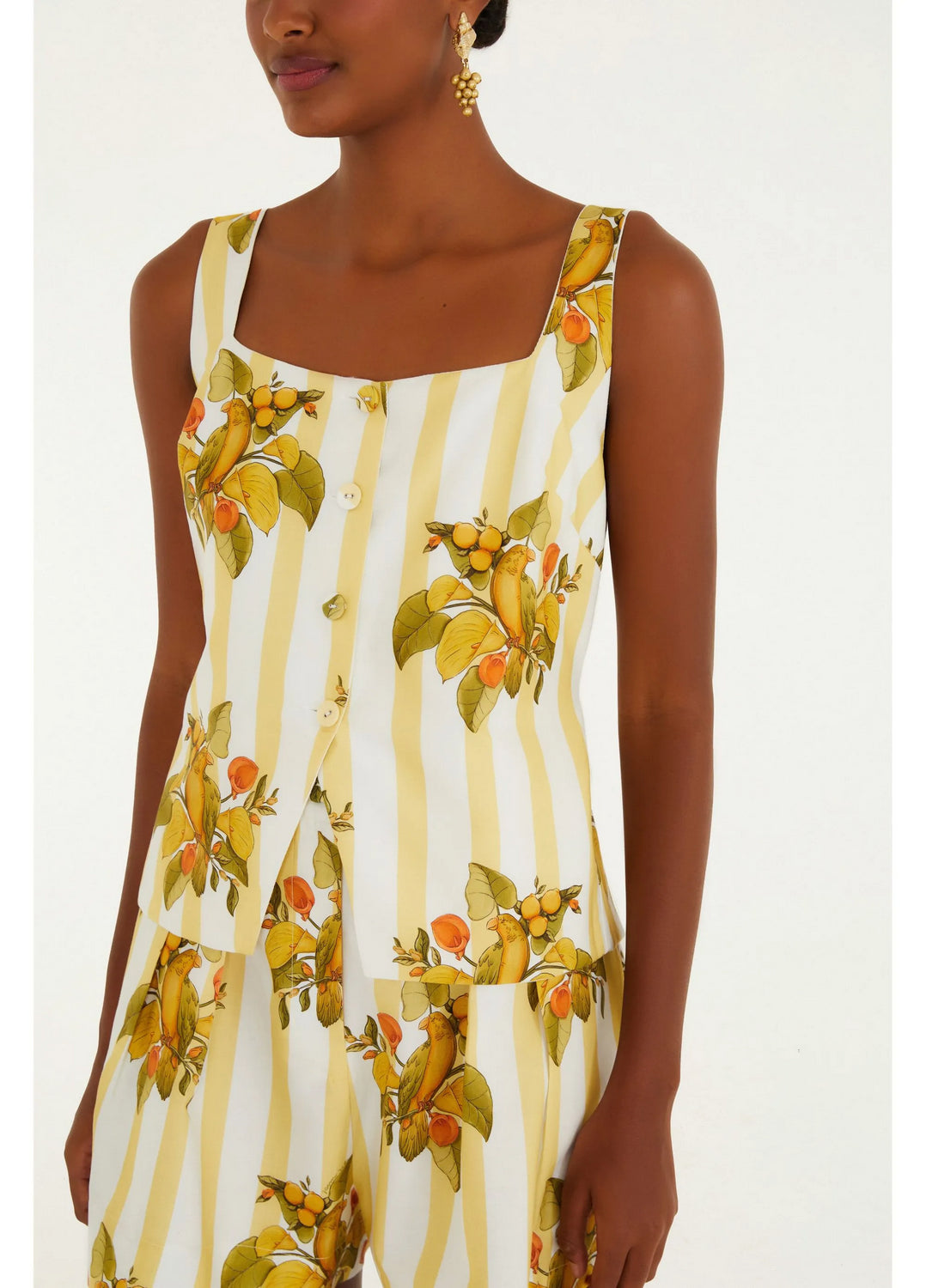 Blusa elegante con estampado de pájaros. El escote cuadrado y los tirantes anchos ofrecen comodidad. Los lazos laterales permiten un ajuste personalizado, aportando ligereza al movimiento. Un toque informal para días soleados que realza cualquier look para actividades al aire libre. Ideal para combinar con vaqueros o prendas ligeras.