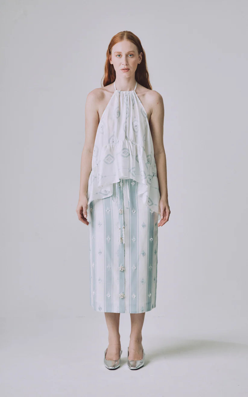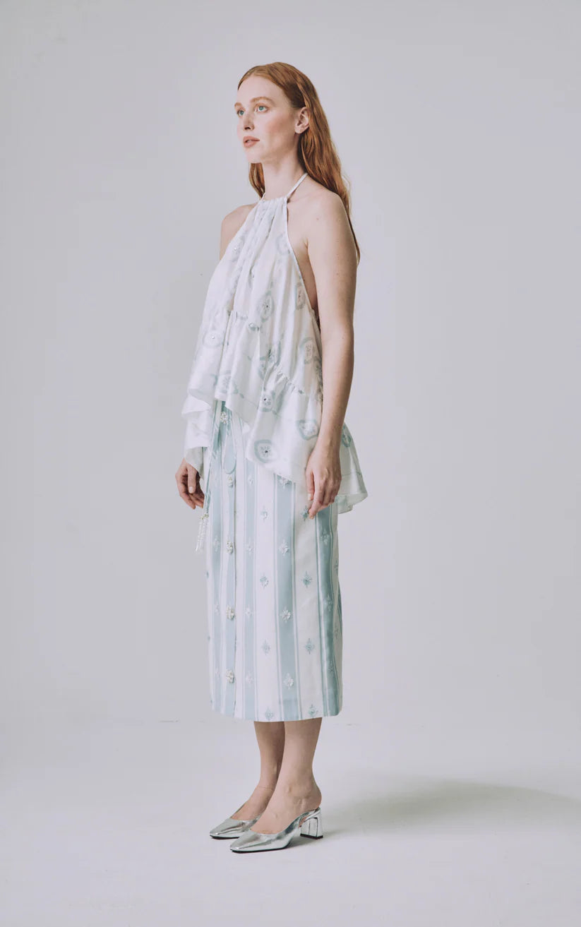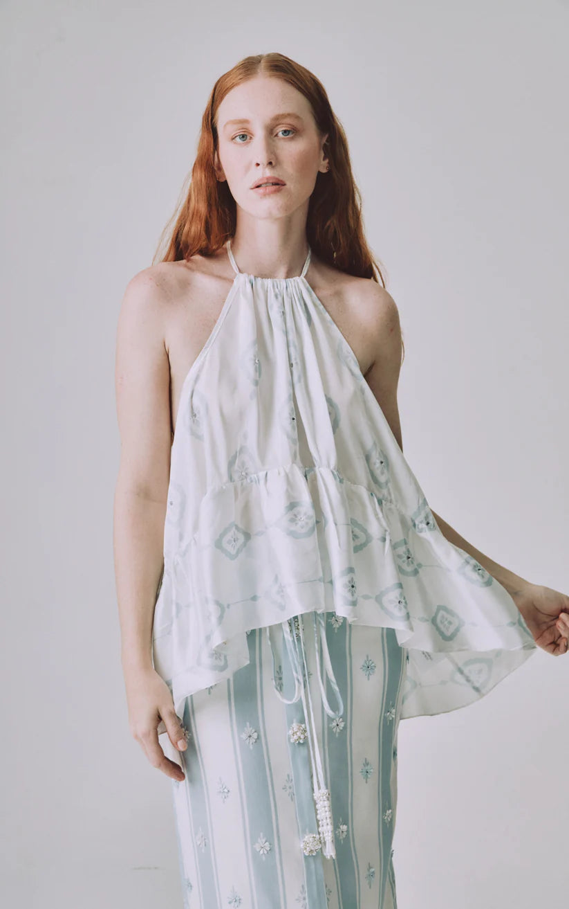 Blusa halter, el equilibrio perfecto entre volumen y movimiento. Su silueta fluida y el bajo asimétrico en capa le dan un aire contemporáneo y elegante, ideal para los días de verano que exigen frescura con intención.