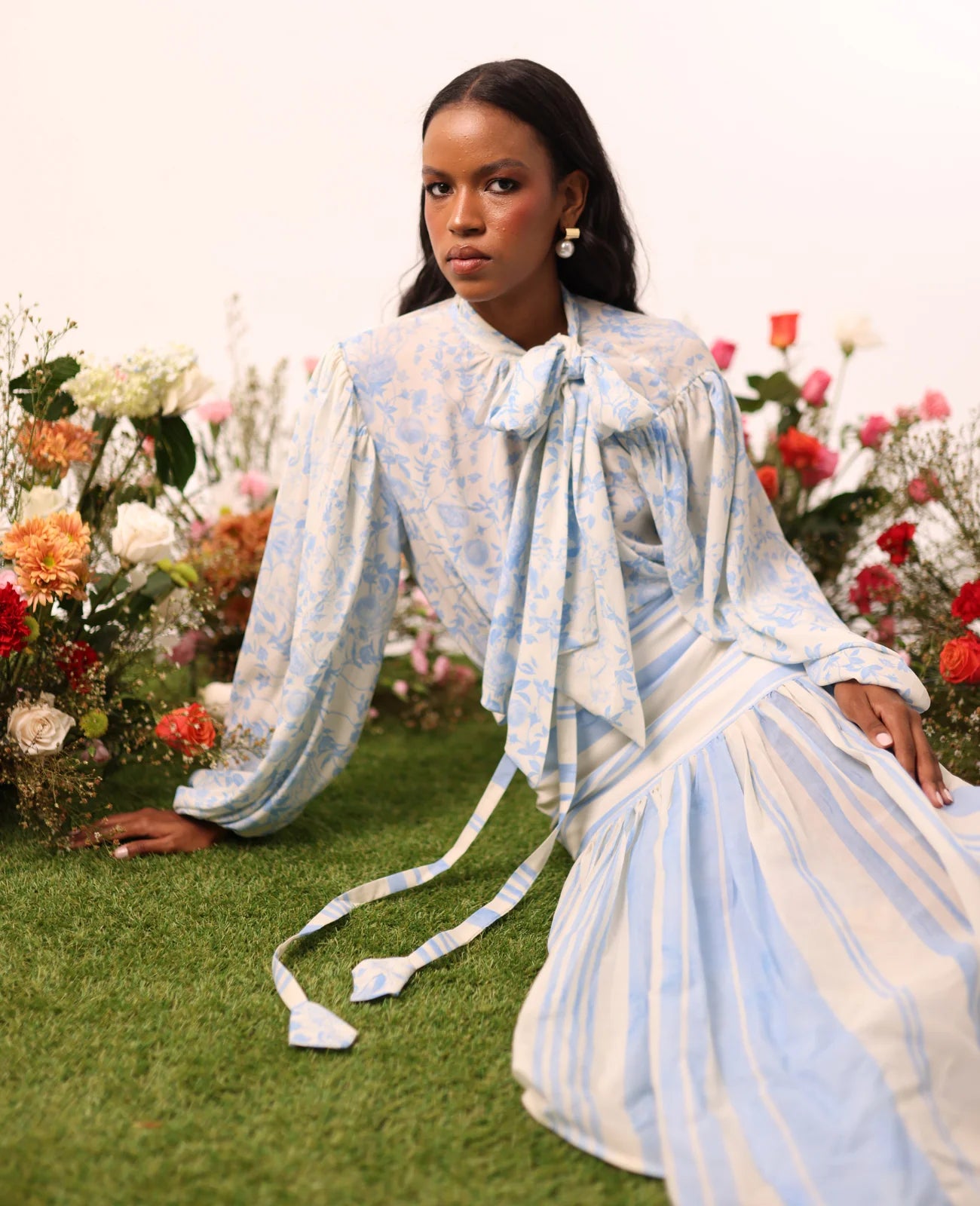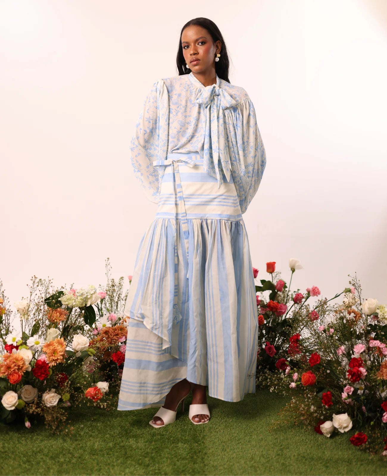 Blusa larga de manga abullonada con puños elásticos, diseñada con una silueta holgada para un ajuste cómodo y elegante. Presenta cuello alto con lazo ajustable, lo que le aporta un toque romántico y versátil. Confeccionada en tela estampada con delicadas flores azules, combina frescura y feminidad.
