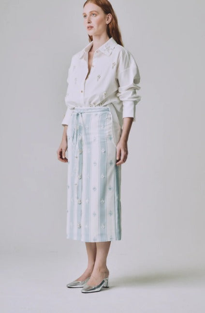 La camisa clásica se reinventa con un toque artesanal. Confeccionada en algodón suave al tacto, esta silueta relajada presenta un bordado floral con delicados abalorios que delinean el cuerpo y el cuello de forma sutil pero sofisticada. Los botones en contraste aportan un toque de calidez, mientras que su corte estructurado la hace versátil.