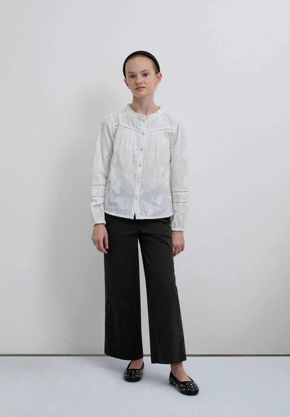 Camisa confeccionada en algodón 100% con cuello pico y manga larga acabada en goma. Cierre botonadura frontal. Detalles bordados flores.