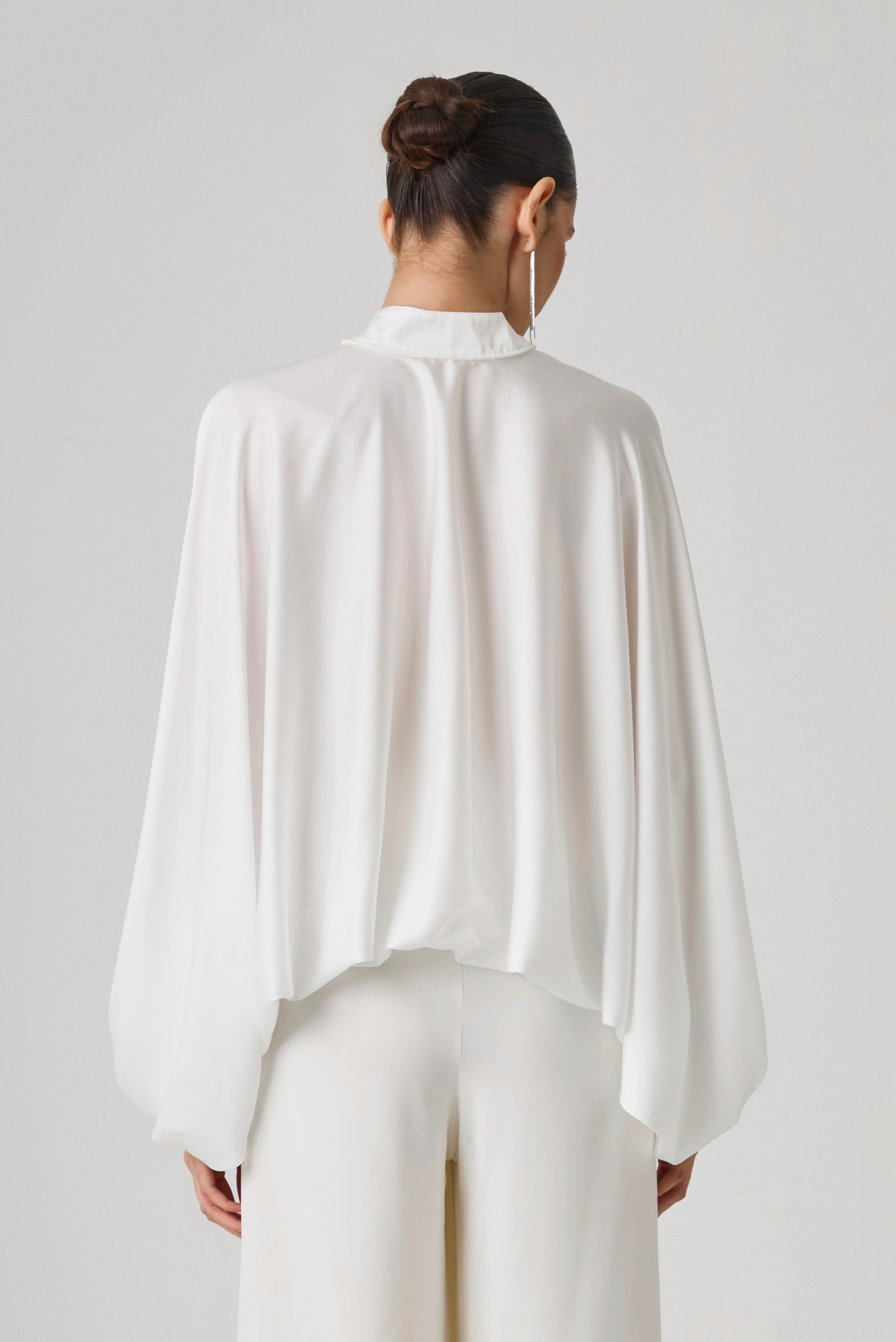 Esta voluminosa blusa de seda irradia elegancia y una caída fresca y fluida. Presenta un elegante escote adornado con un lazo trenzado y delicadas plumas. Perfecta para cualquier ocasión, esta blusa combina a la perfección una refinada sofisticación con un toque de encanto caprichoso.