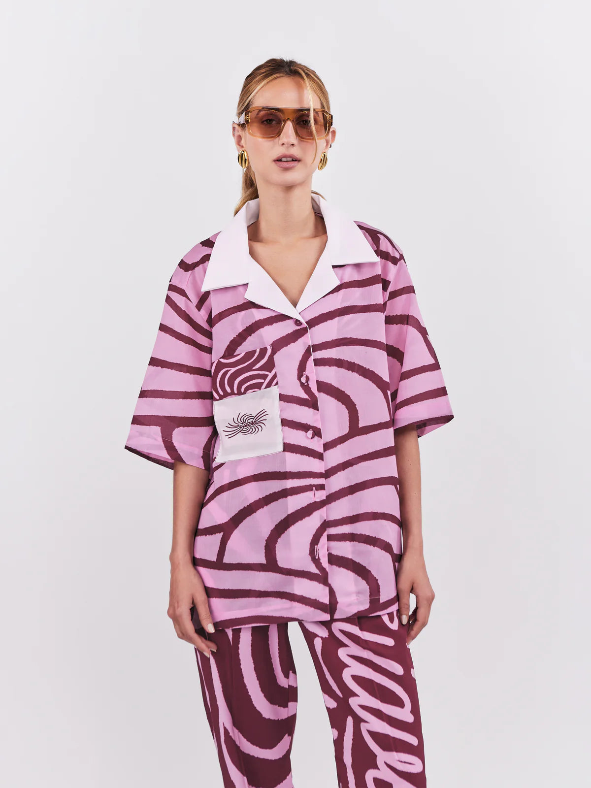 Camisa con cuello y mangas tres cuartos. Botones al frente. Bolsillo delantero derecho con gráfico bordado.