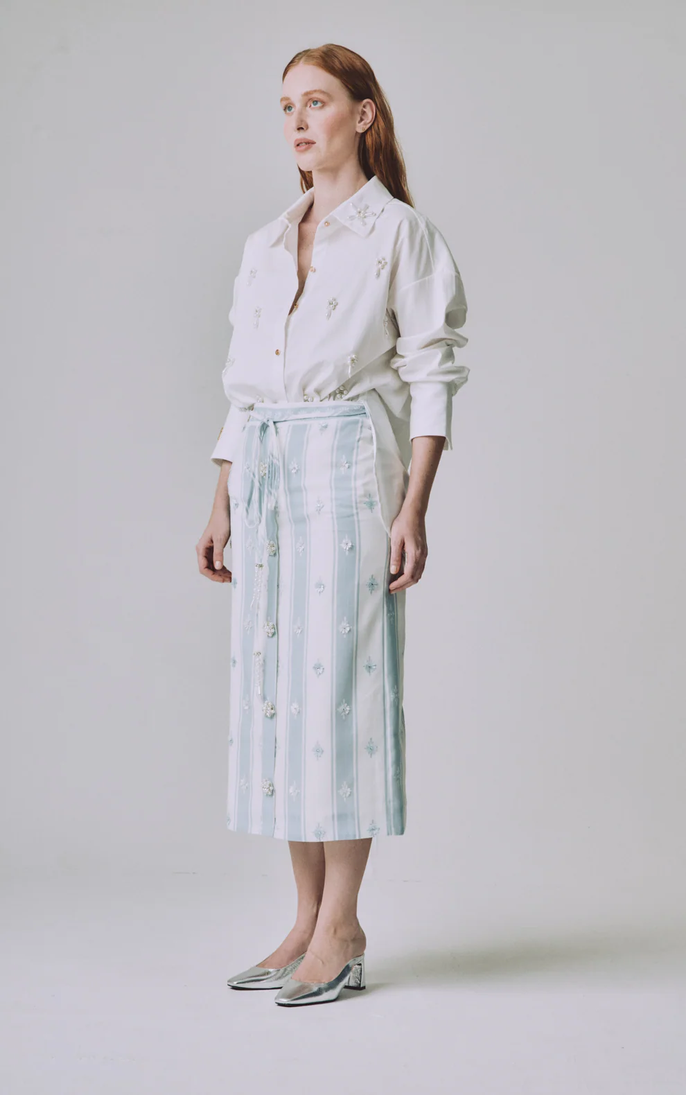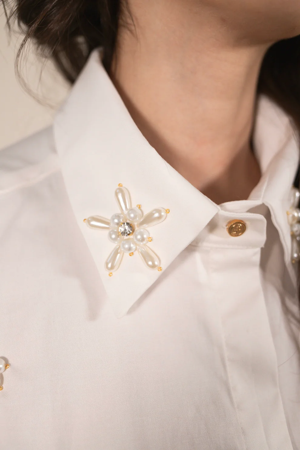 La camisa clásica se reinventa con un toque artesanal. Confeccionada en algodón suave al tacto, esta silueta relajada presenta un bordado floral con delicados abalorios que delinean el cuerpo y el cuello de forma sutil pero sofisticada. Los botones en contraste aportan un toque de calidez, mientras que su corte estructurado la hace versátil.