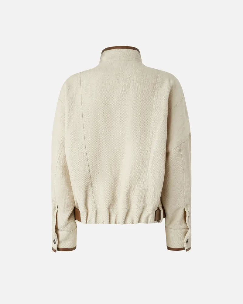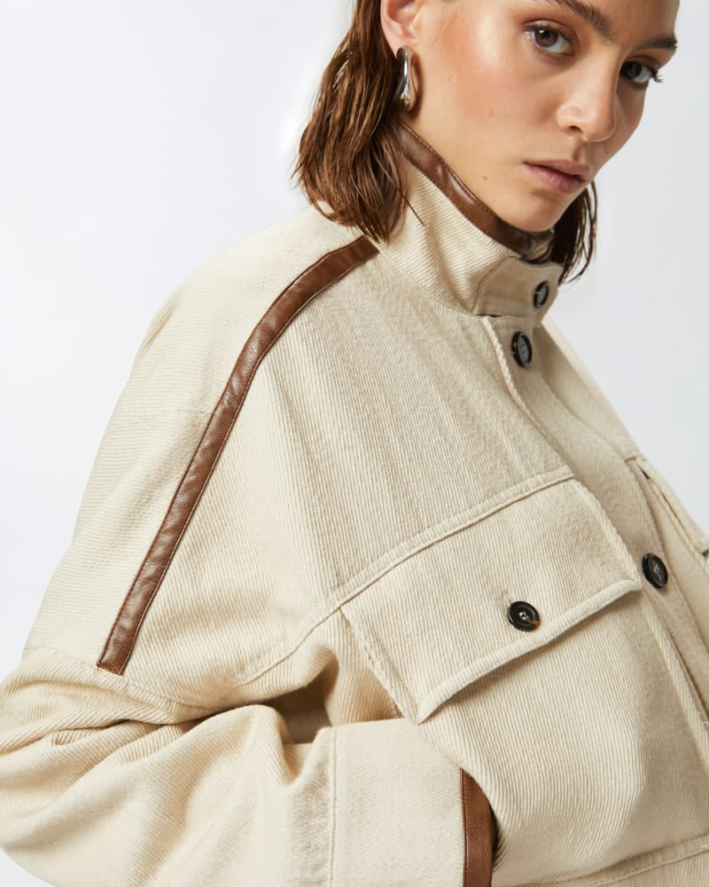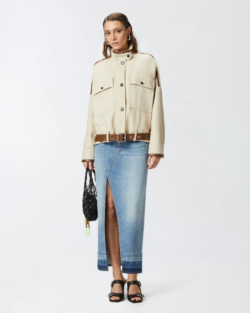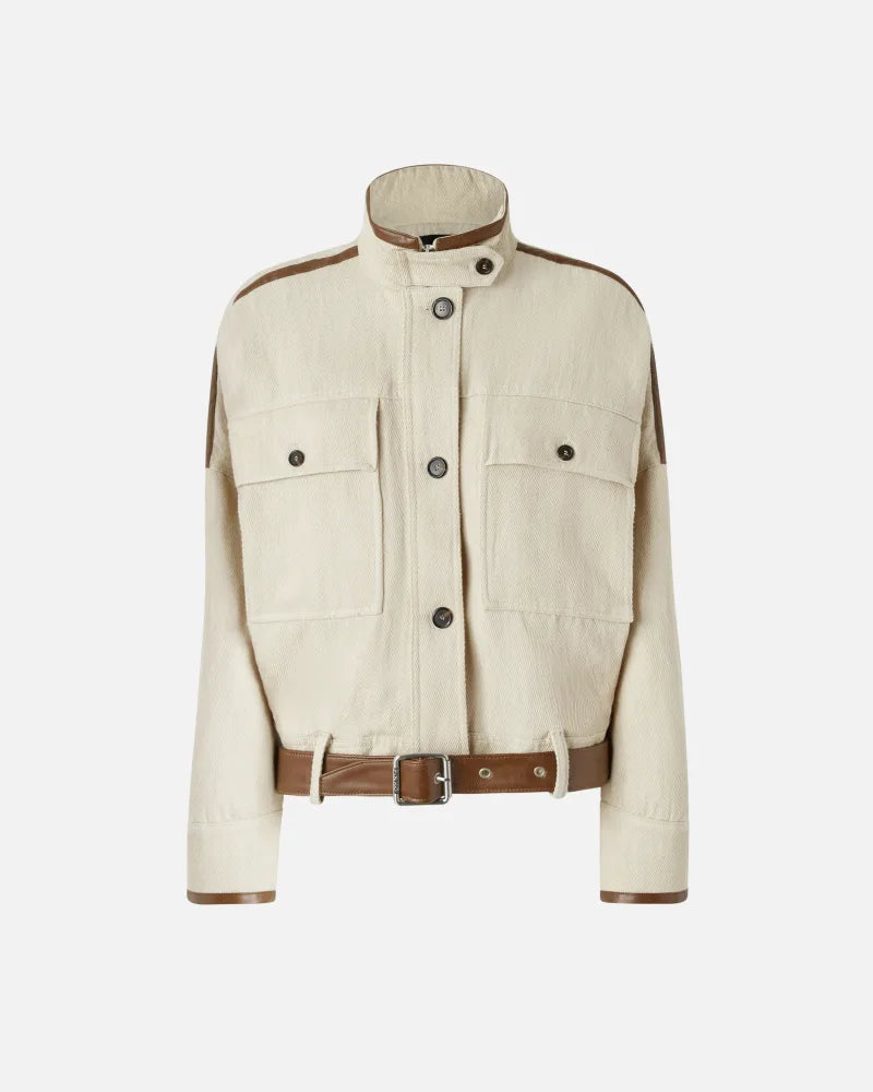 Chaqueta blusón corta y holgada, confeccionada en una mezcla de algodón y lino de textura gruesa y tejido diagonal, con ribetes de tejido revestido efecto piel. Esta chaqueta, la prenda ideal para el inicio de la temporada, presenta un pequeño cuello alto con trabilla abotonada, mangas largas anchas y bajas, bolsillos de parche maxi con solapa y un bolsillo lateral en la costura. Está forrada y ligeramente acolchada para mayor comodidad y cuenta con un cinturón de piel sintética en la parte inferior que redondea el diseño y permite ajustar el ajuste. La cremallera metálica se cierra con una tapeta abotonada.