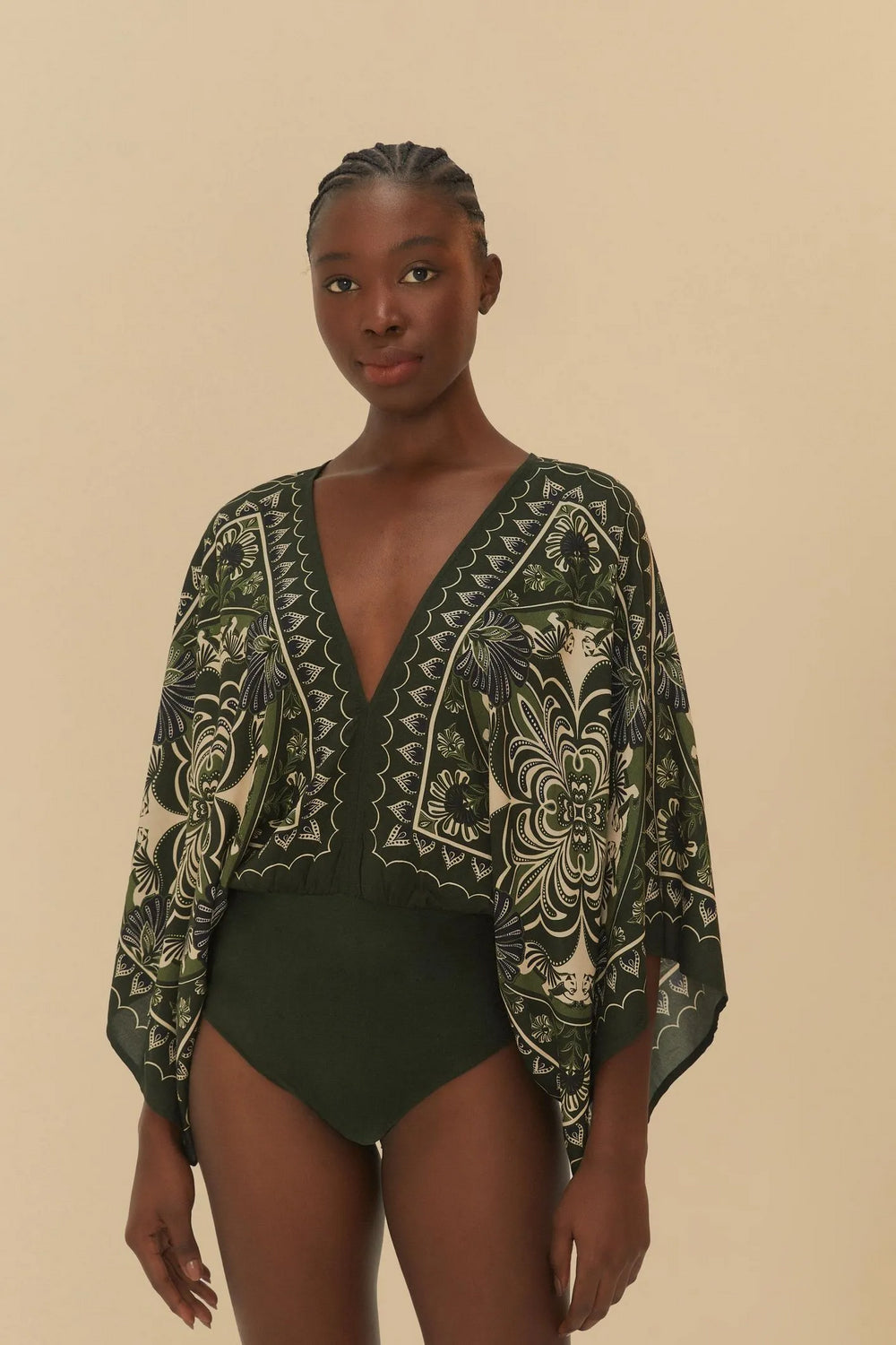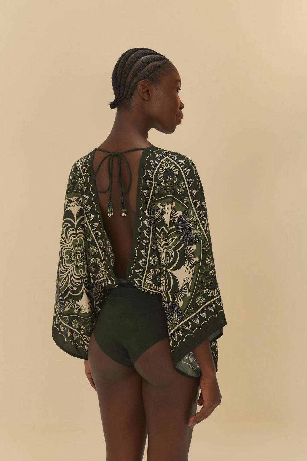Body con pañuelo y estampado de leopardo místico. Presenta un escote en V pronunciado que realza los hombros al descubierto y un corte ajustado que garantiza comodidad y estilo. Los tirantes finos aportan ligereza, mientras que el estampado exclusivo aporta un toque de originalidad. Perfecto para un look casual o un evento especial.