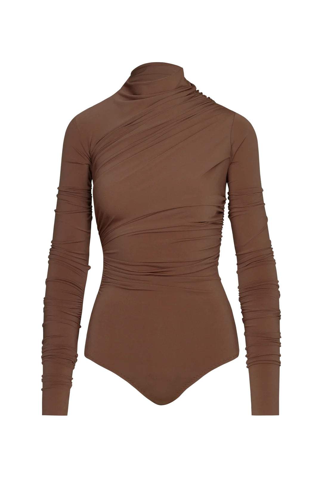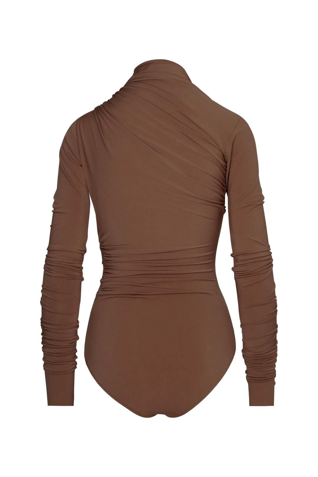El body Nostalgia presenta un fruncido de diseño experto y un escote alto, confeccionado en tela suave y ceñida para una silueta favorecedora. El fruncido aporta textura y profundidad, mientras que el cuello alto le da un toque moderno.