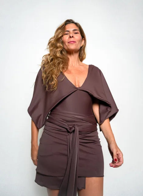 Body enterizo con mangas con volados, escote en V y aplique decorativo con baño en plata.