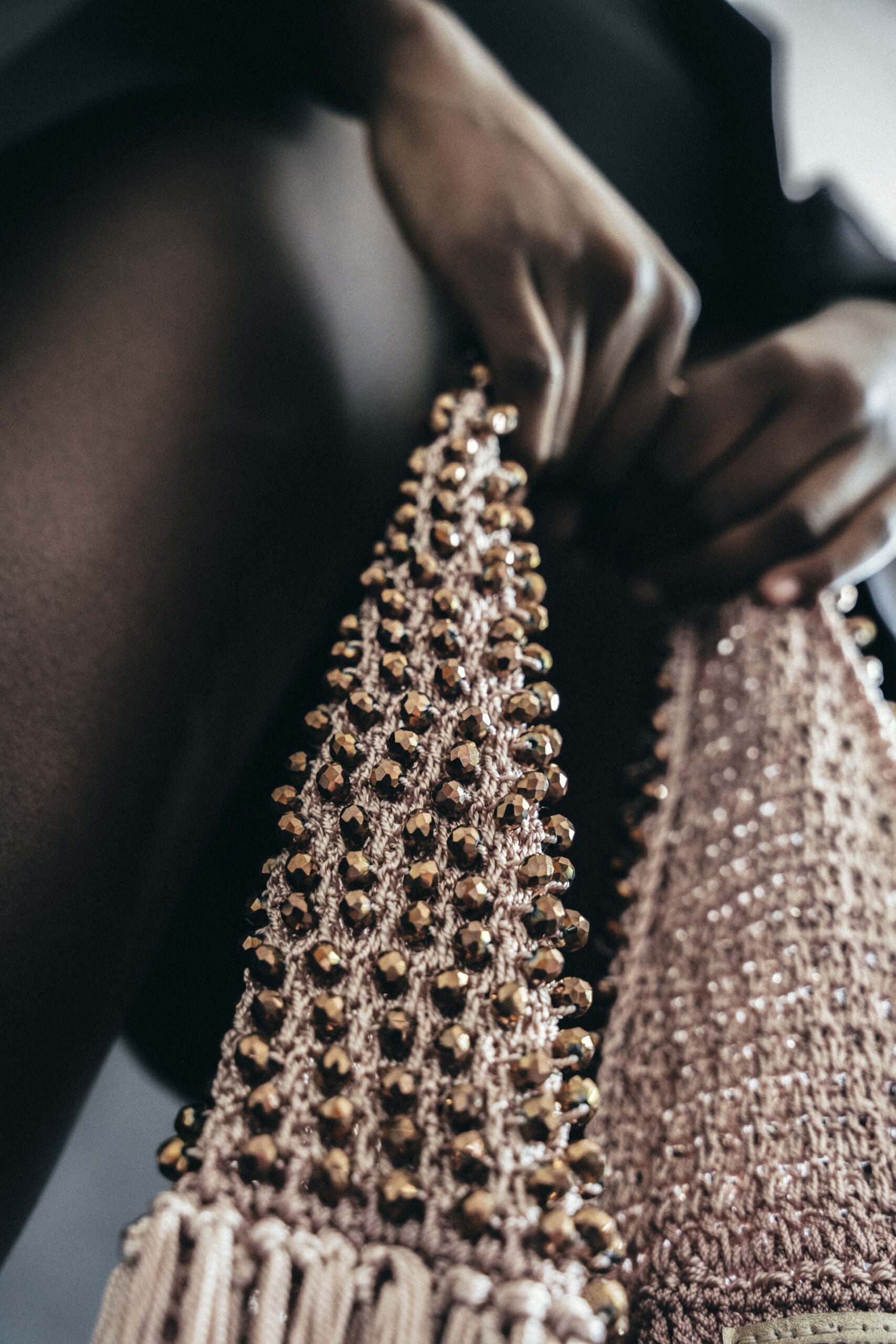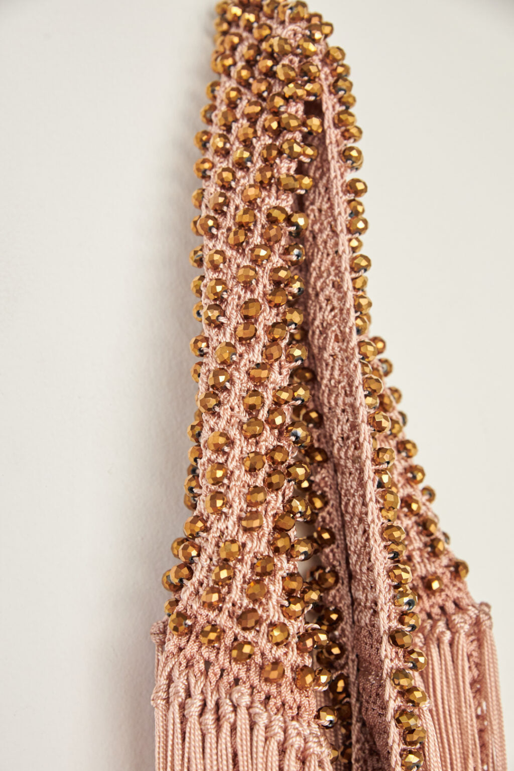 Bolso tejido a mano con fibras textiles. Color: rosa, bordado con cristales marrones. Medidas: 50 x 25 cm.