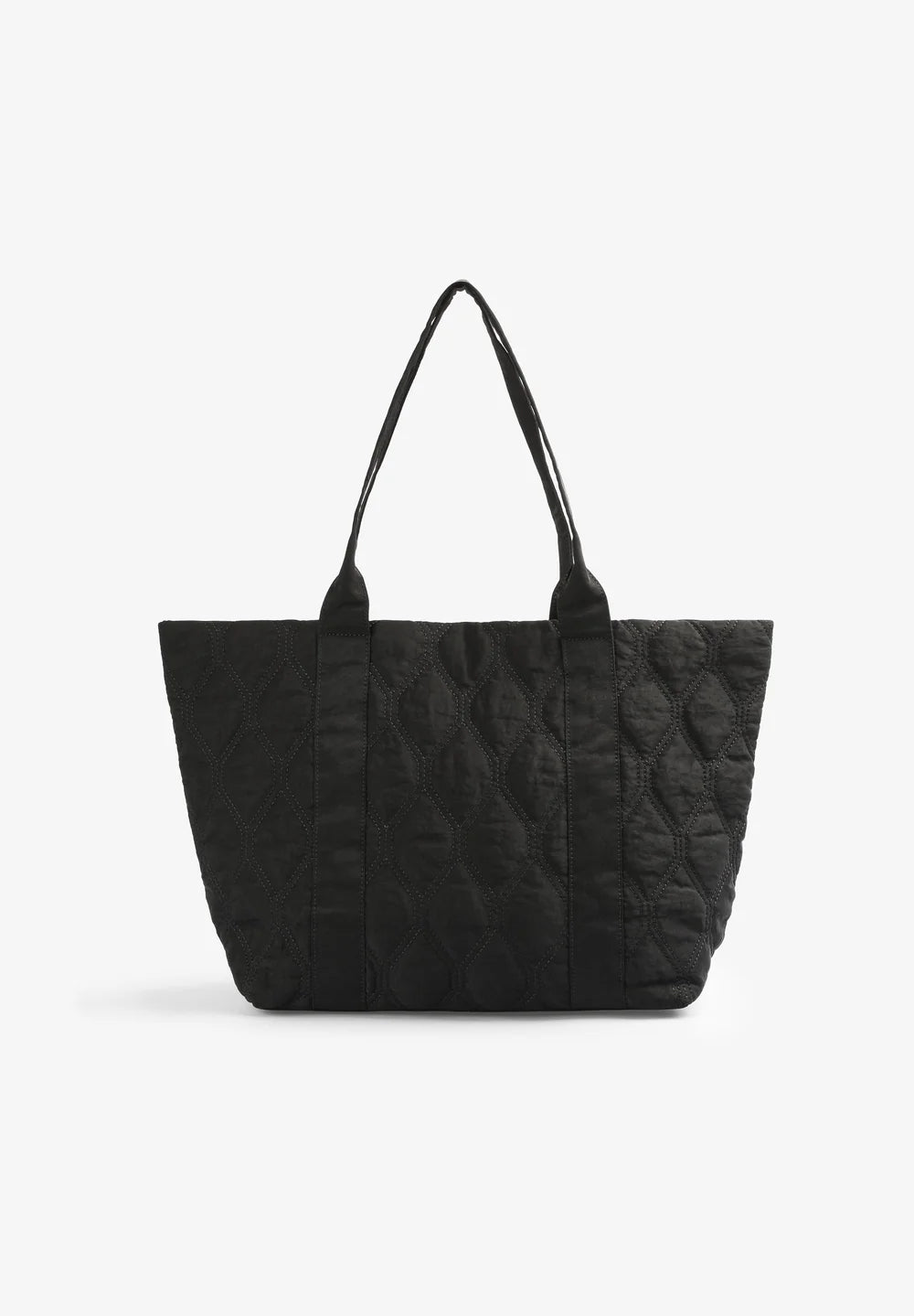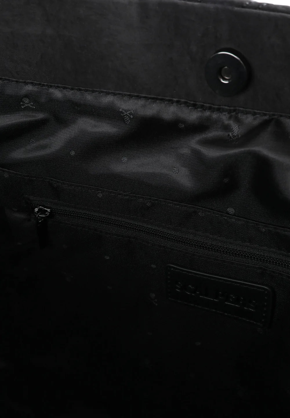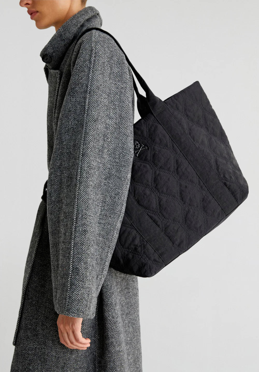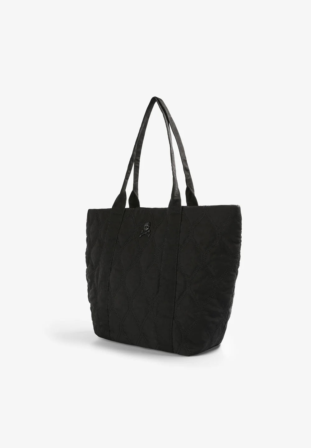 Bolso shopper acolchado confeccionado en nylon. Doble asa y cierre con snap. Bolsillo interior y calavera metálica.