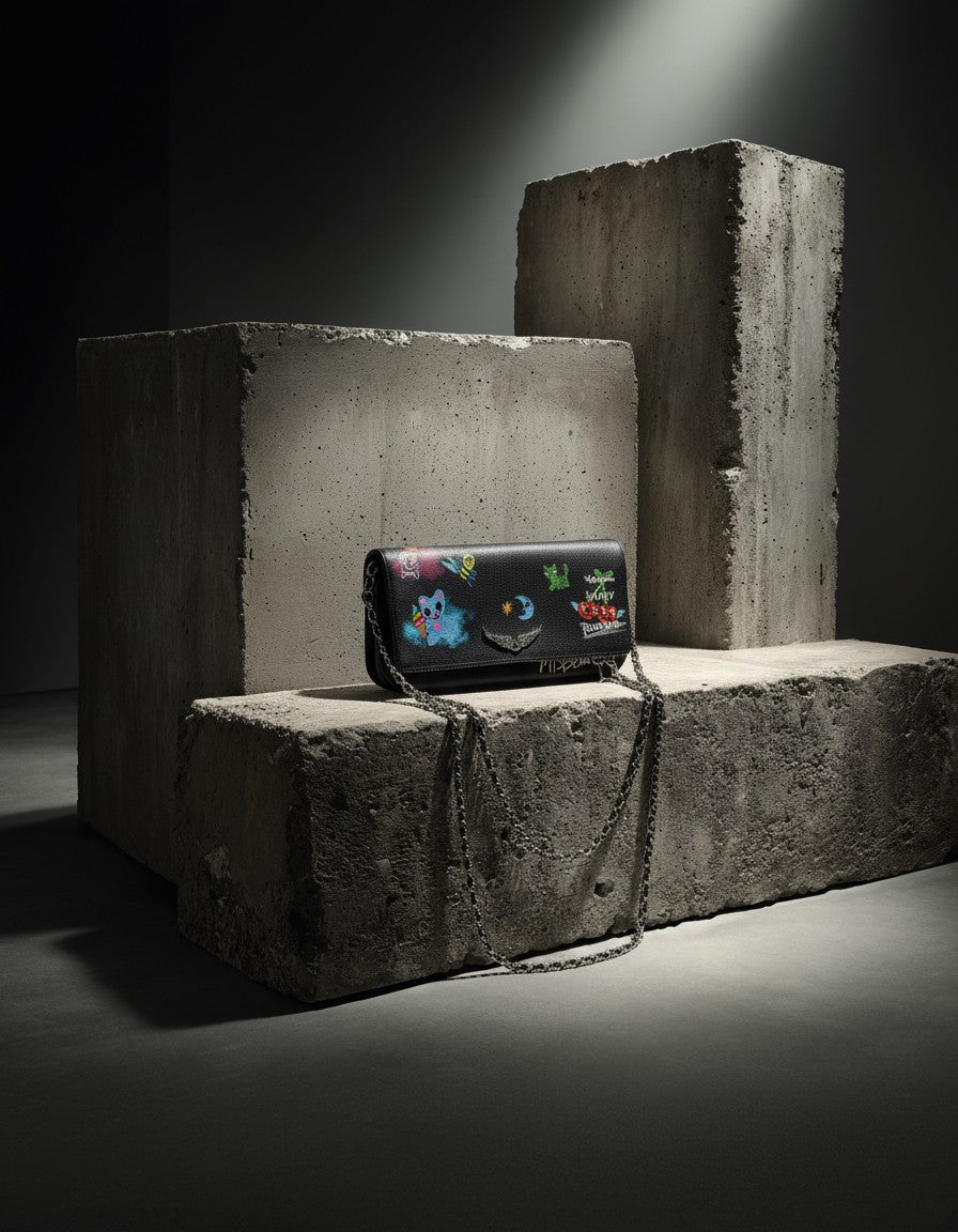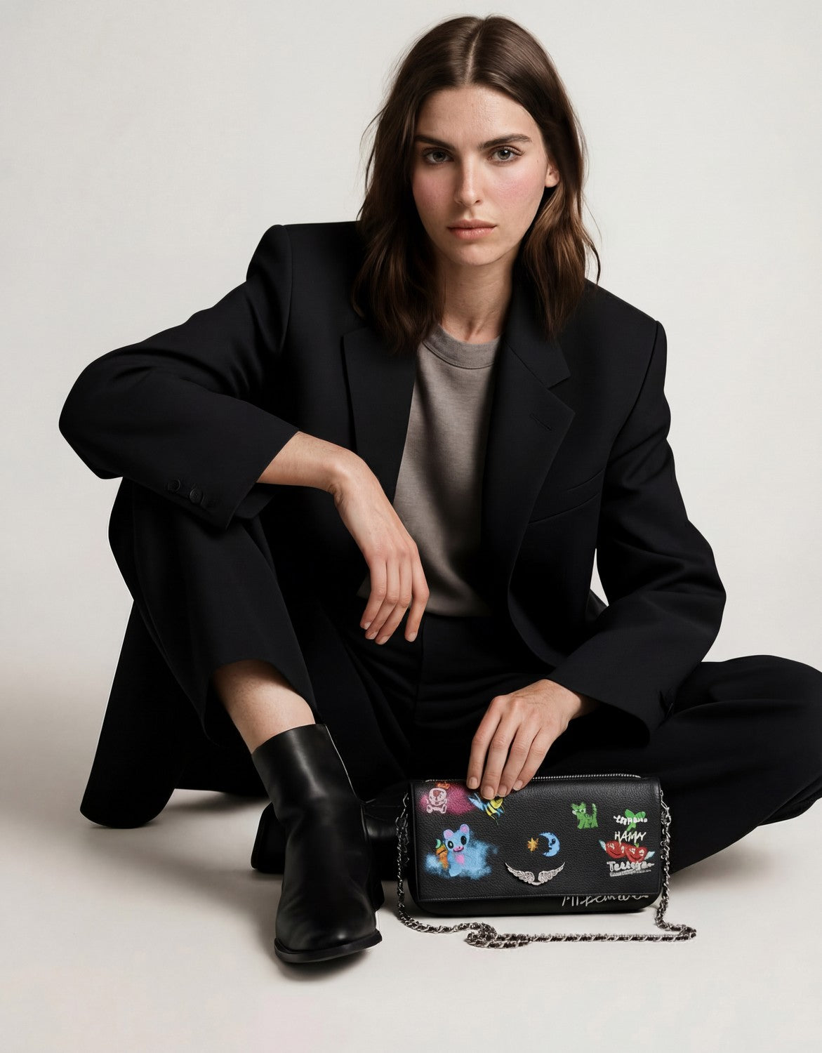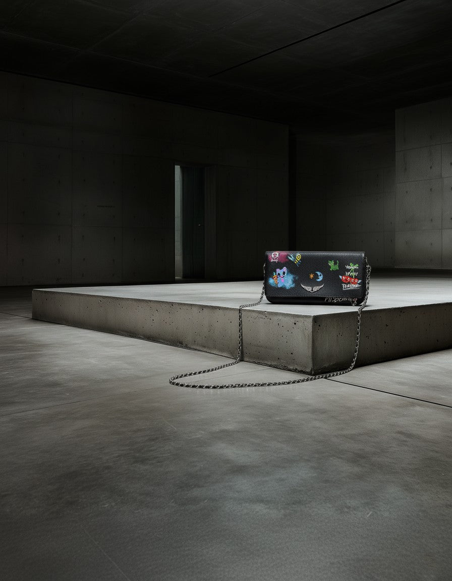 Bolso de mano o clutch de silueta rectangular y compacta, su diseño llamativo de gráficos y parches multicolor le confiere un toque divertido, irreverente y punk. En el centro se puede apreciar la insignia icónica de alas de Zadig & Voltaire, en metal plateado.