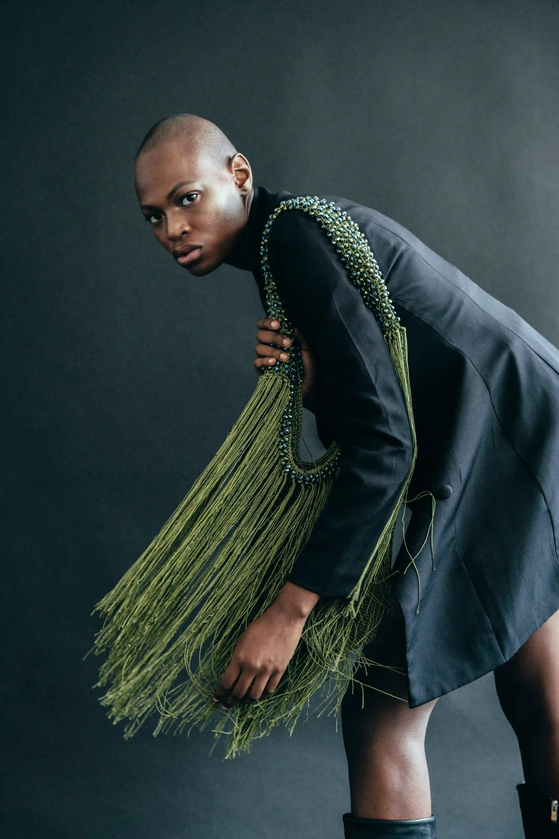 Bolso tejido a mano con fibras textiles. Color verde, bordado con cristales iridiscentes verdes.