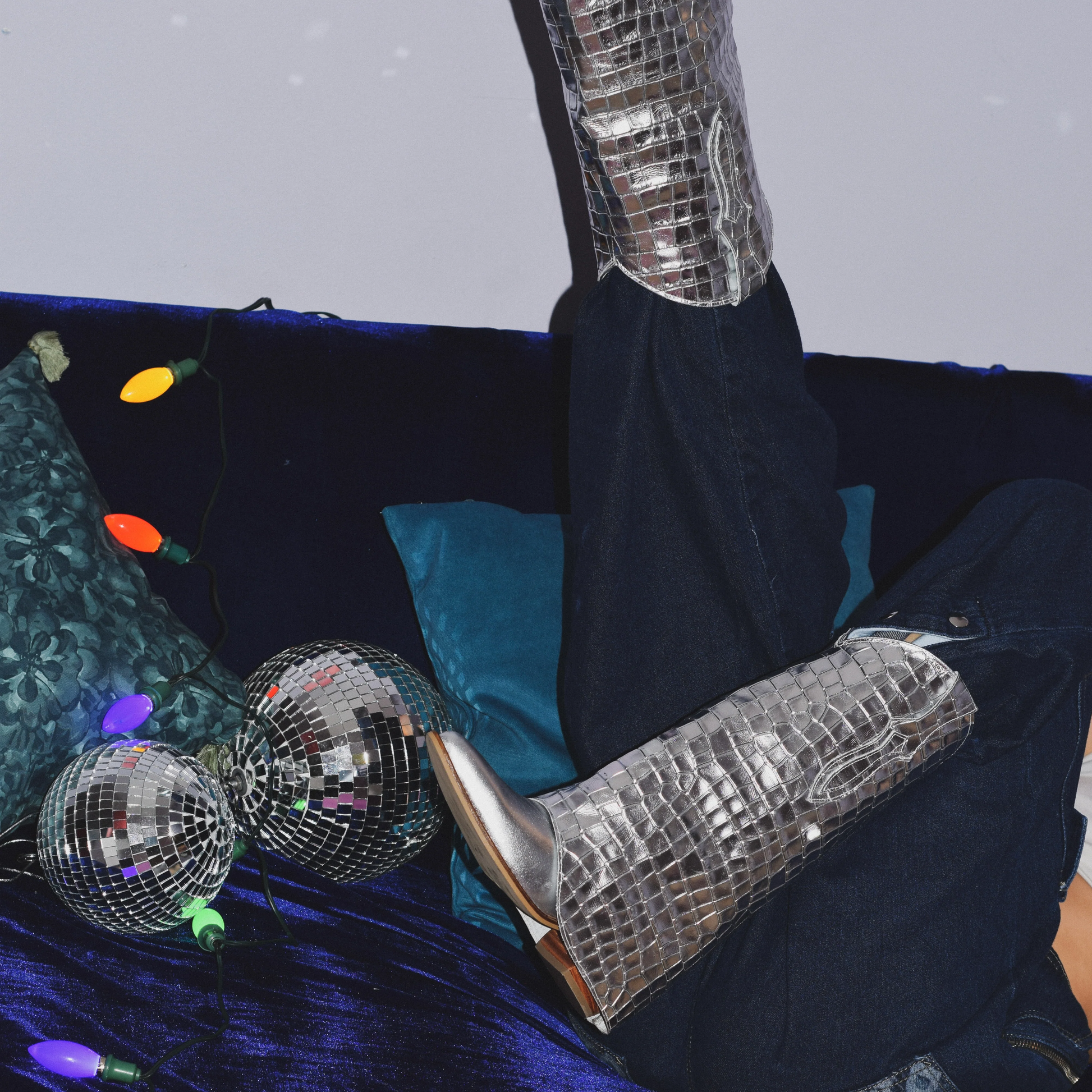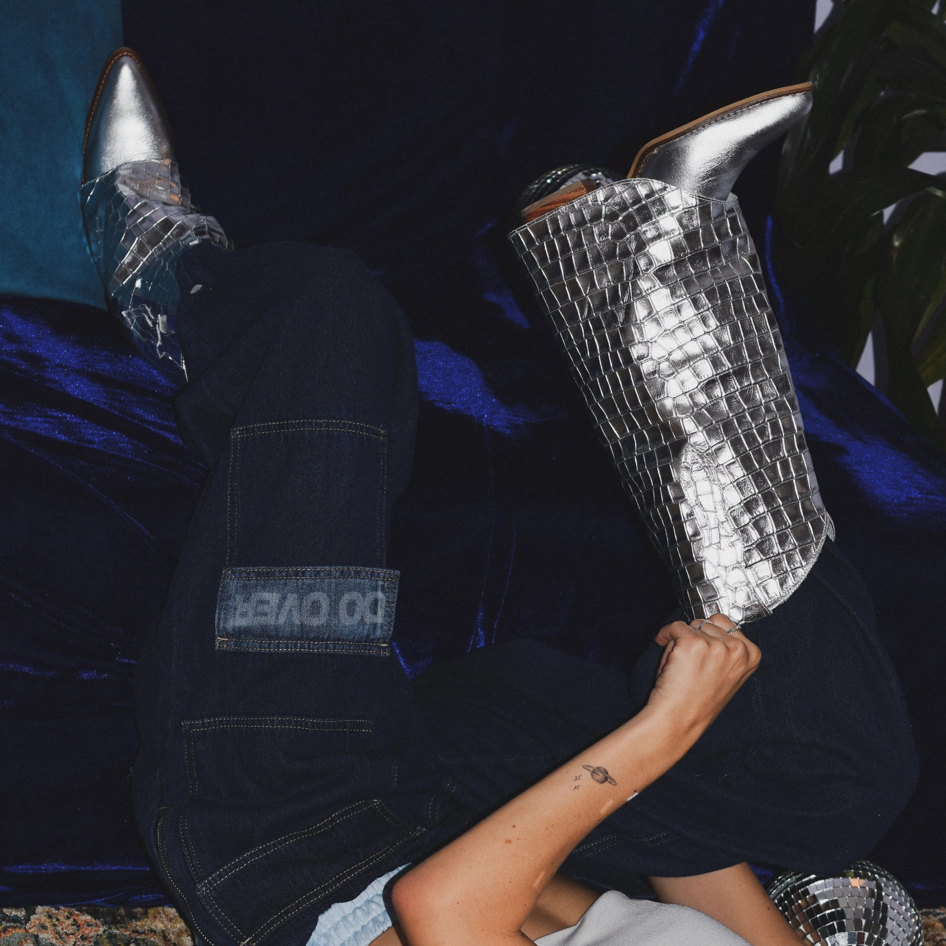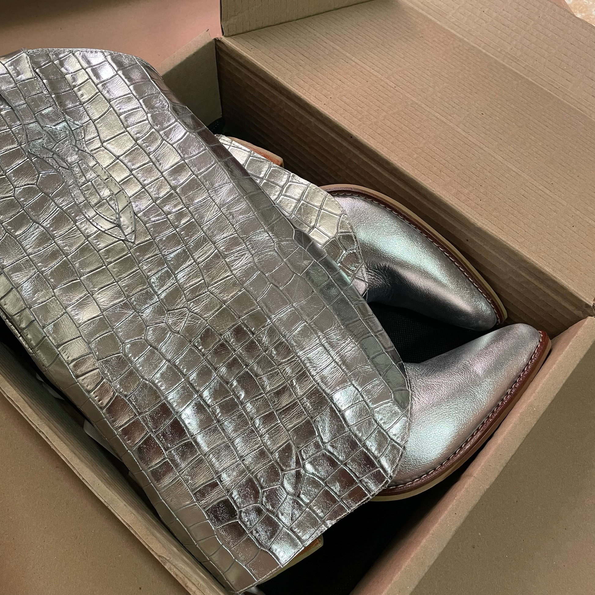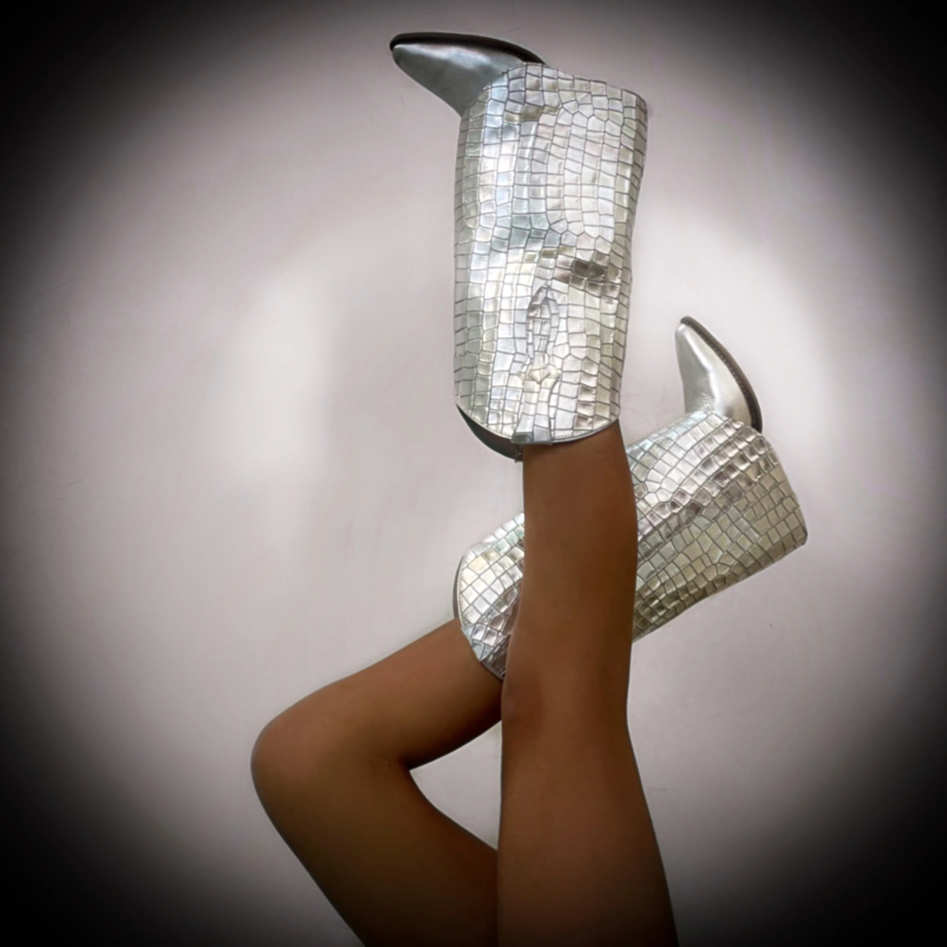 Luce poderosa con las Botas Vaqueras Circe Plata, un statement de moda audaz e icónico. Confeccionadas en cuero metalizado, su diseño western combina lo clásico del estilo cowboy con una estética moderna y urbana. Perfectas para elevar cualquier outfit de día o noche.