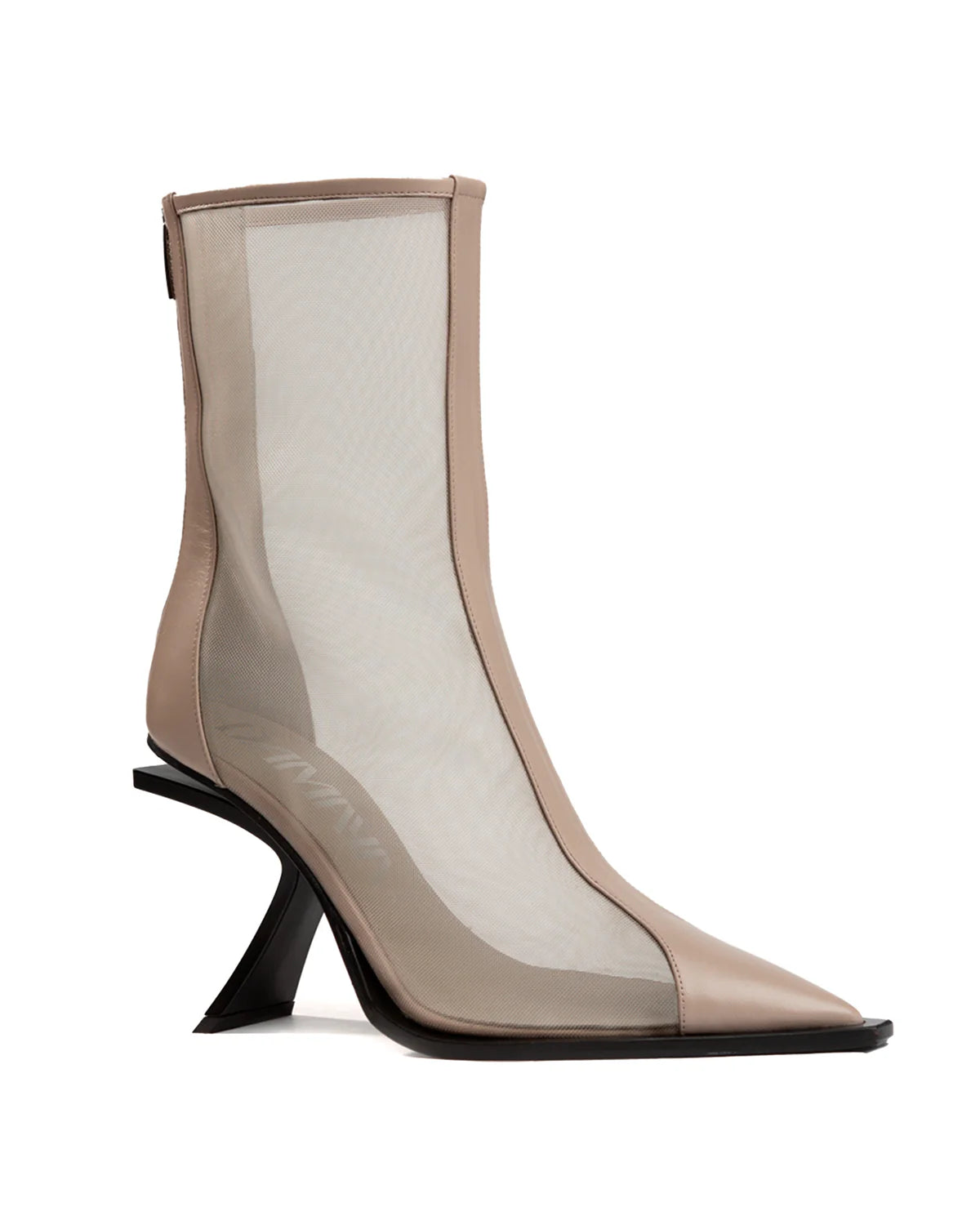 La bota Synth está confeccionada en piel de becerro napa y malla, creando una silueta transparente y estructurada. La punta puntiaguda y el cuello alto enmarcan el tobillo con gran precisión. Una cremallera oculta recorre la espalda para facilitar su uso. Terminado con nuestro tacón mate curvo de 90 mm y suela de cuero extendida.