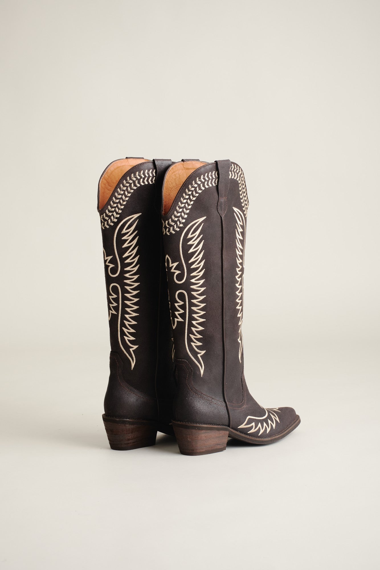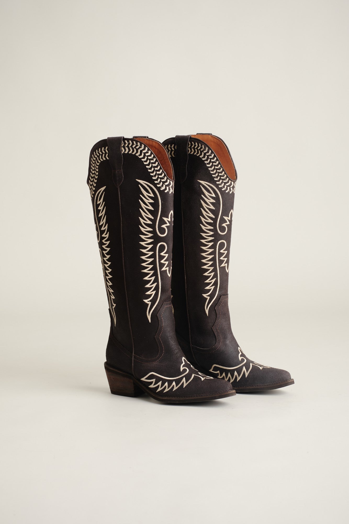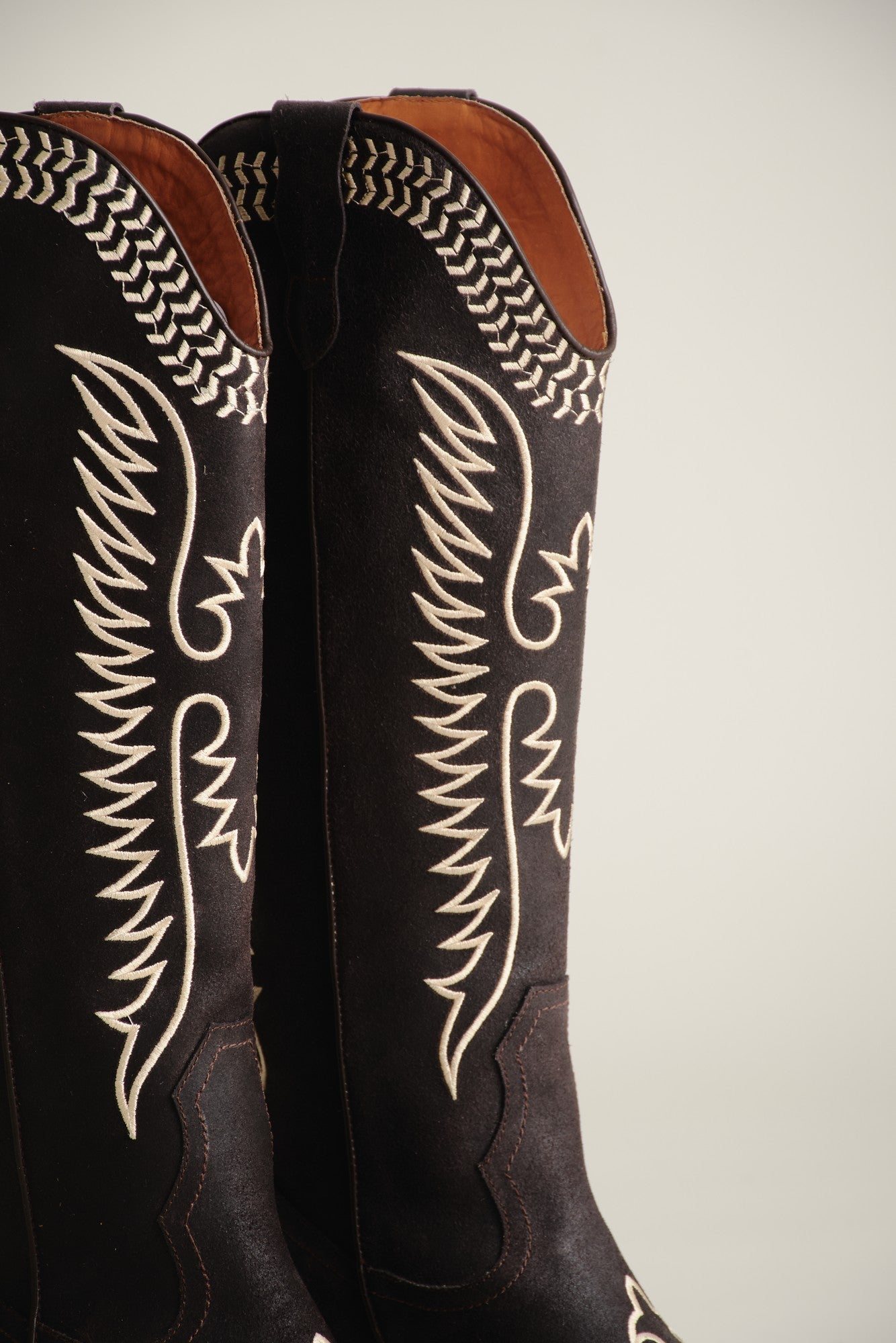 Botas de caña alta, con un estilo clásico vaquero. Los bordados tienen un diseño de ala o pluma y se extienden a lo largo de la caña y en el empeine.
