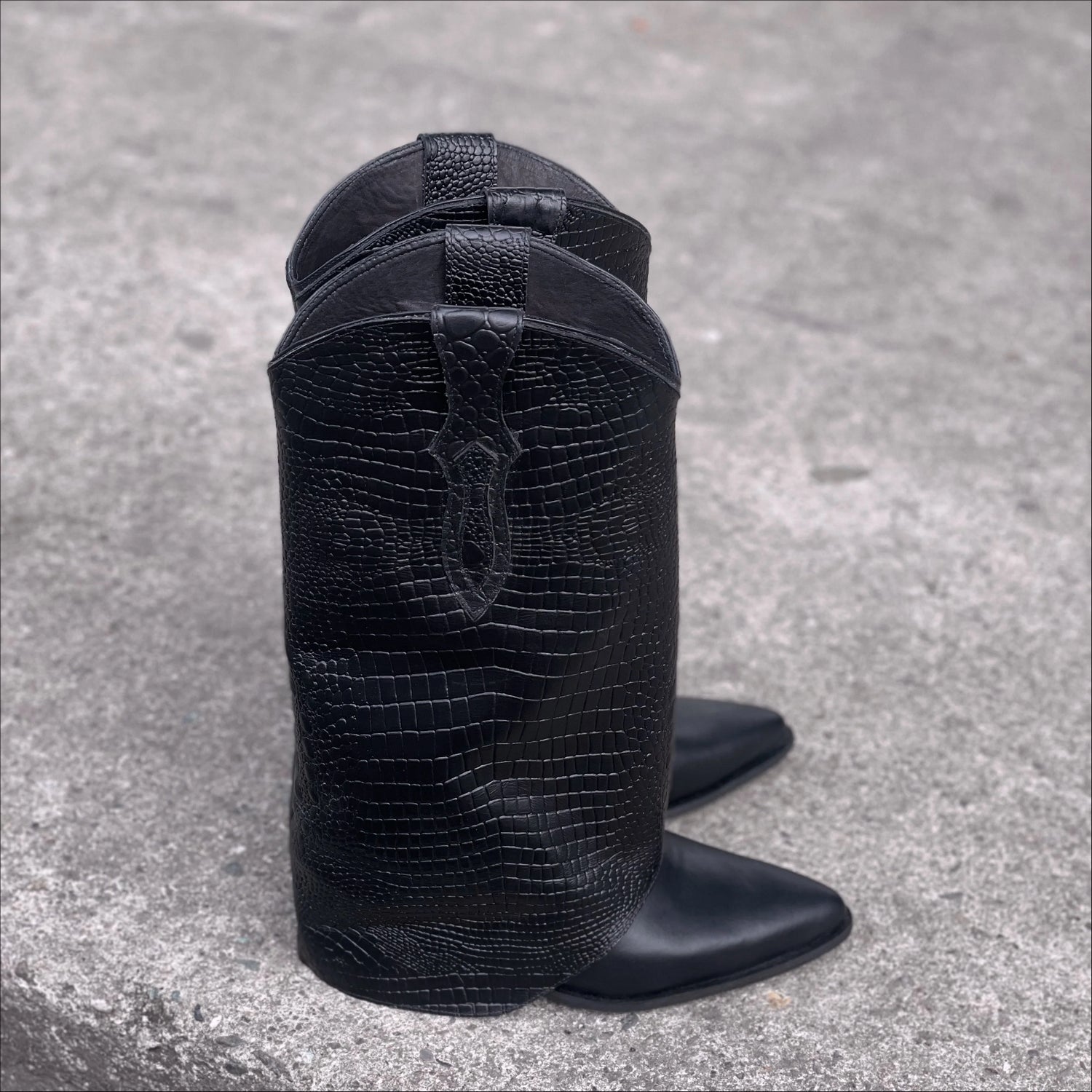 Botas caña media victoria estilo PantsBoots Vaqueras, fabricadas 100% en cuero bovino con diferentes texturas y tacón texano en madera.