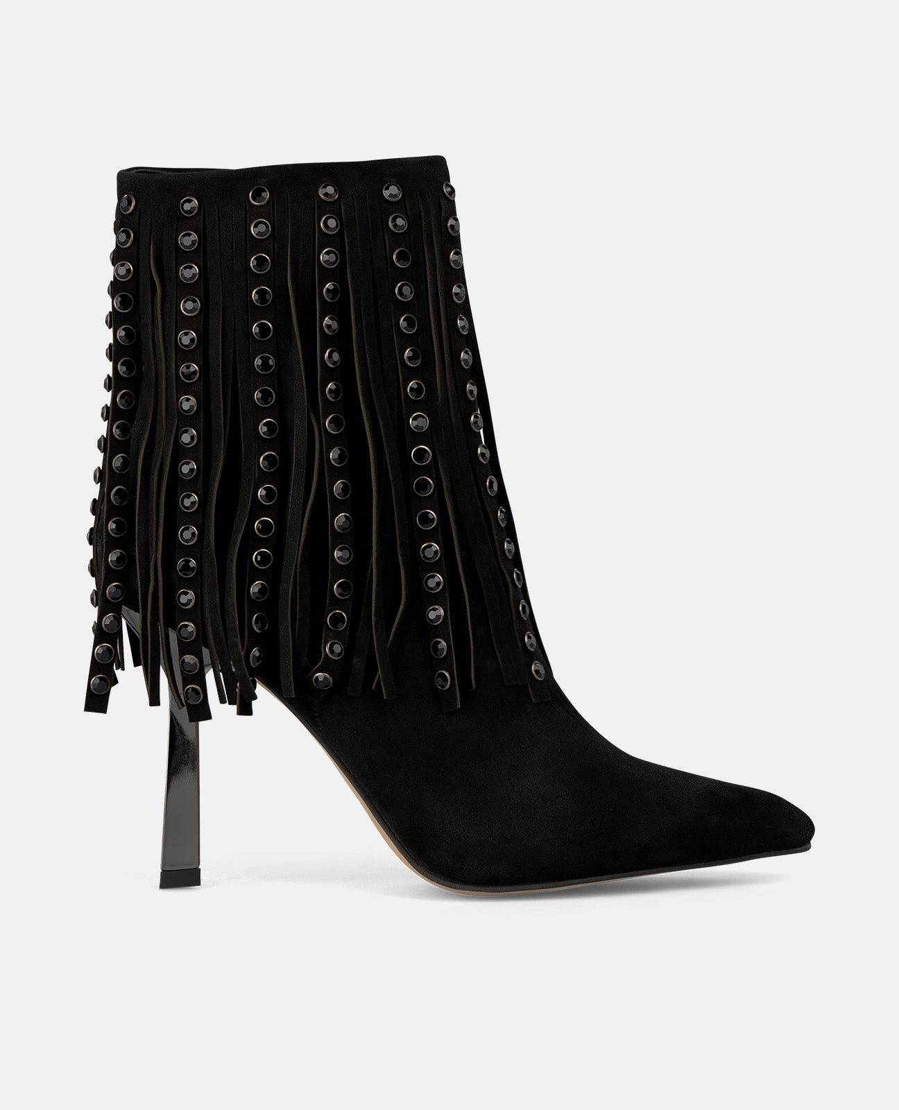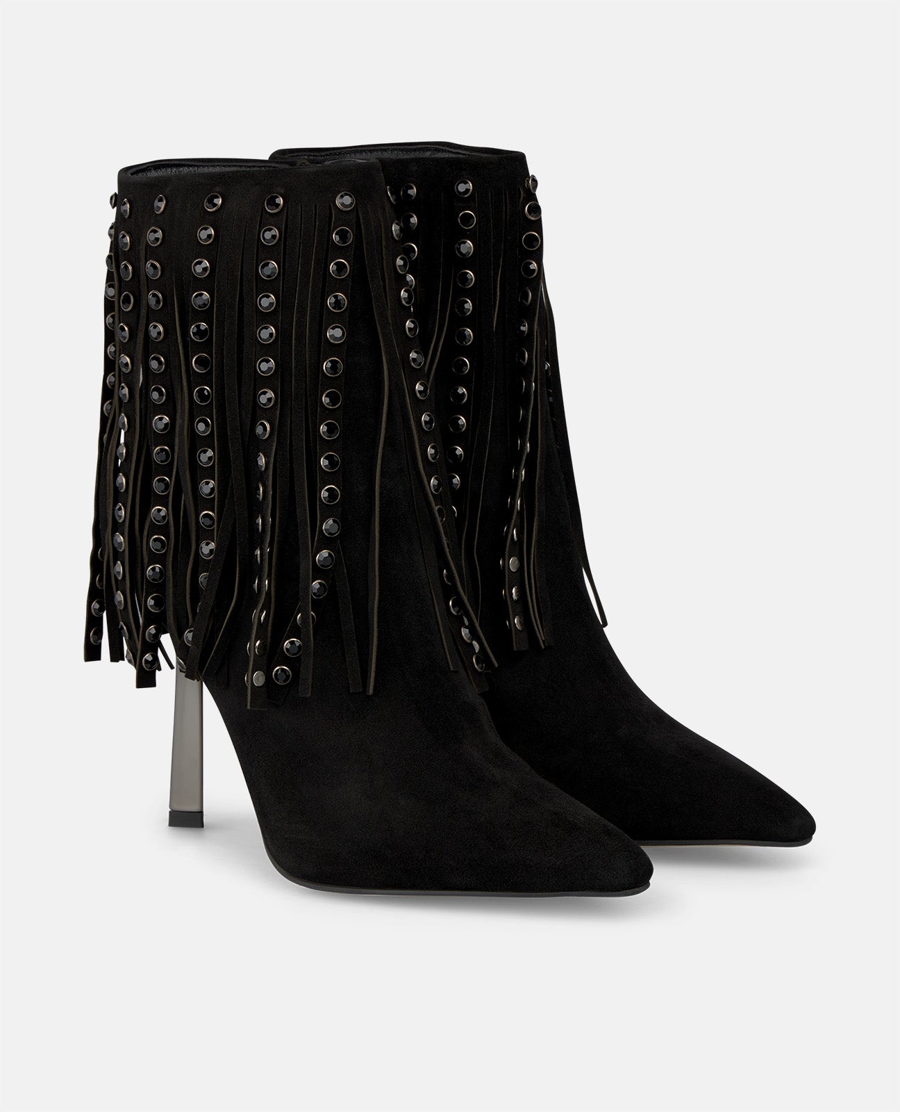Botín de tacón para mujer, flecos largos con tachas. Con puntera afilada y tacón de aguja, cierre con cremallera. La altura del tacón es de 10,5cm y la caña mide 13,5cm.