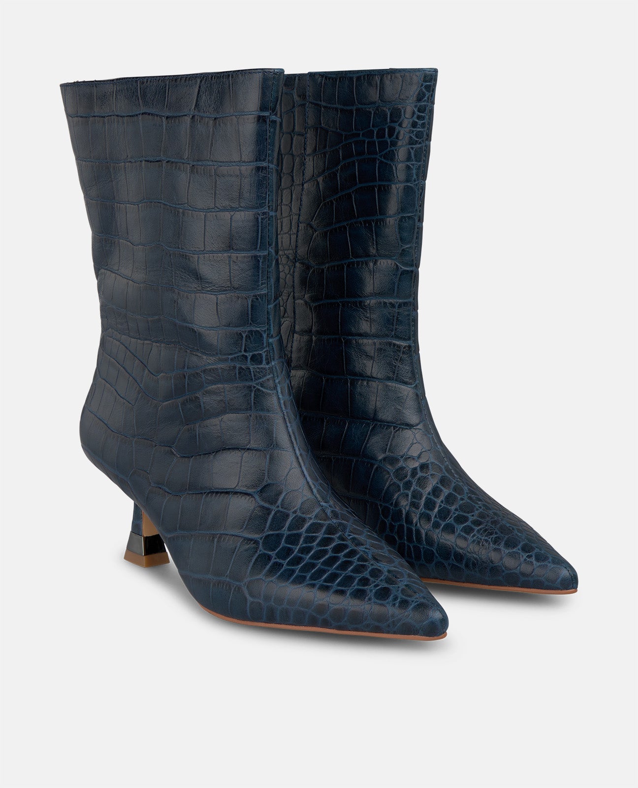 Botín de tacón mini para mujer con detalle metalizado. Con puntera afilada y tacón de aguja, sin cierre. La altura del tacón es de 6cm y la caña mide 17cm.