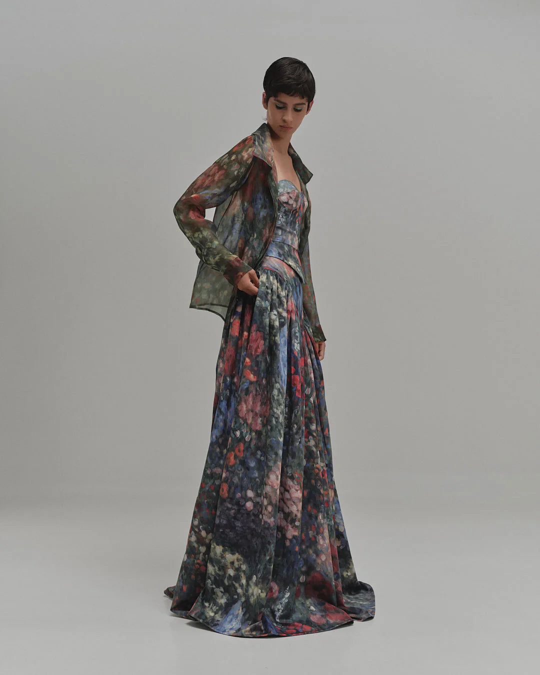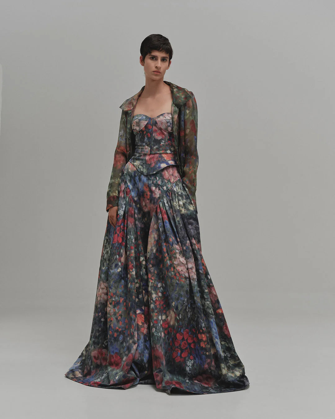 El corsé Contorno presenta una silueta estructurada sin tirantes con copas definidas y costuras que se adaptan al contorno. Confeccionado con un vibrante estampado floral, ofrece un ajuste esculpido que realza la cintura, convirtiéndolo en una prenda destacada para usar en capas o en solitario.