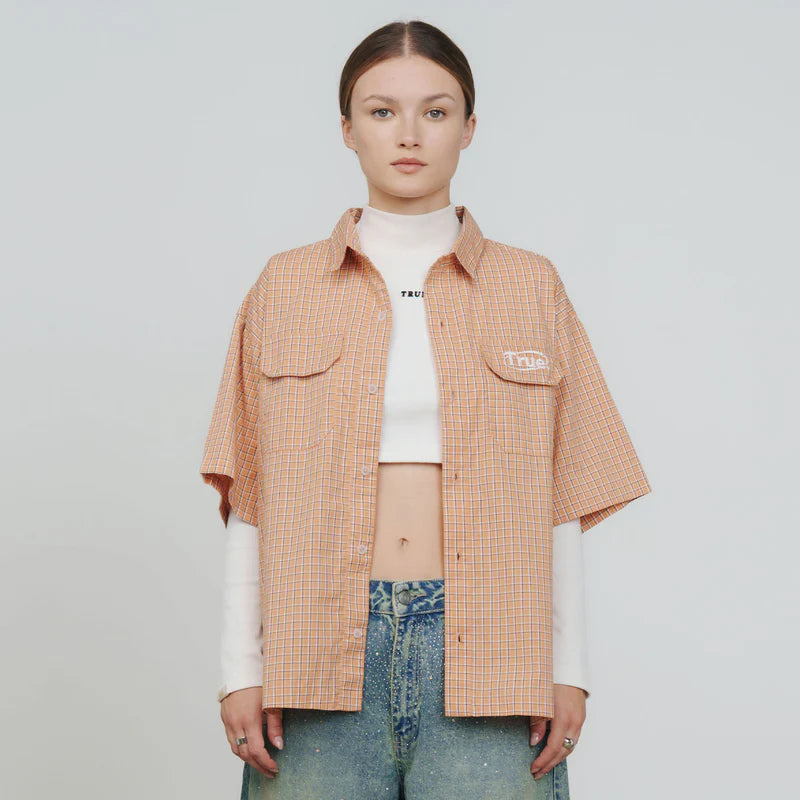 Camisa manga corta de botones, color naranja a cuadros. Está hecha en algodón con silueta boxy, viene con un bolsillo frontal con tapa y el logo bordado en ella.