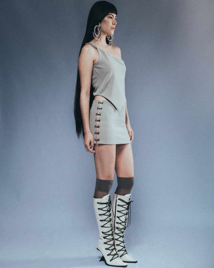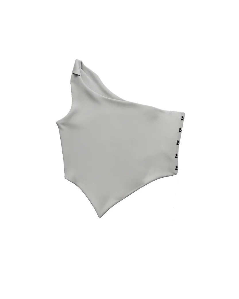 Sofisticación asimétrica con un edge inesperado. Su diseño de un hombro entorchado y broches en el costado crean una silueta minimalista pero arriesgada. Un statement piece para quienes desafían lo convencional.