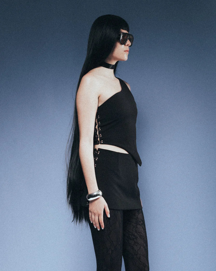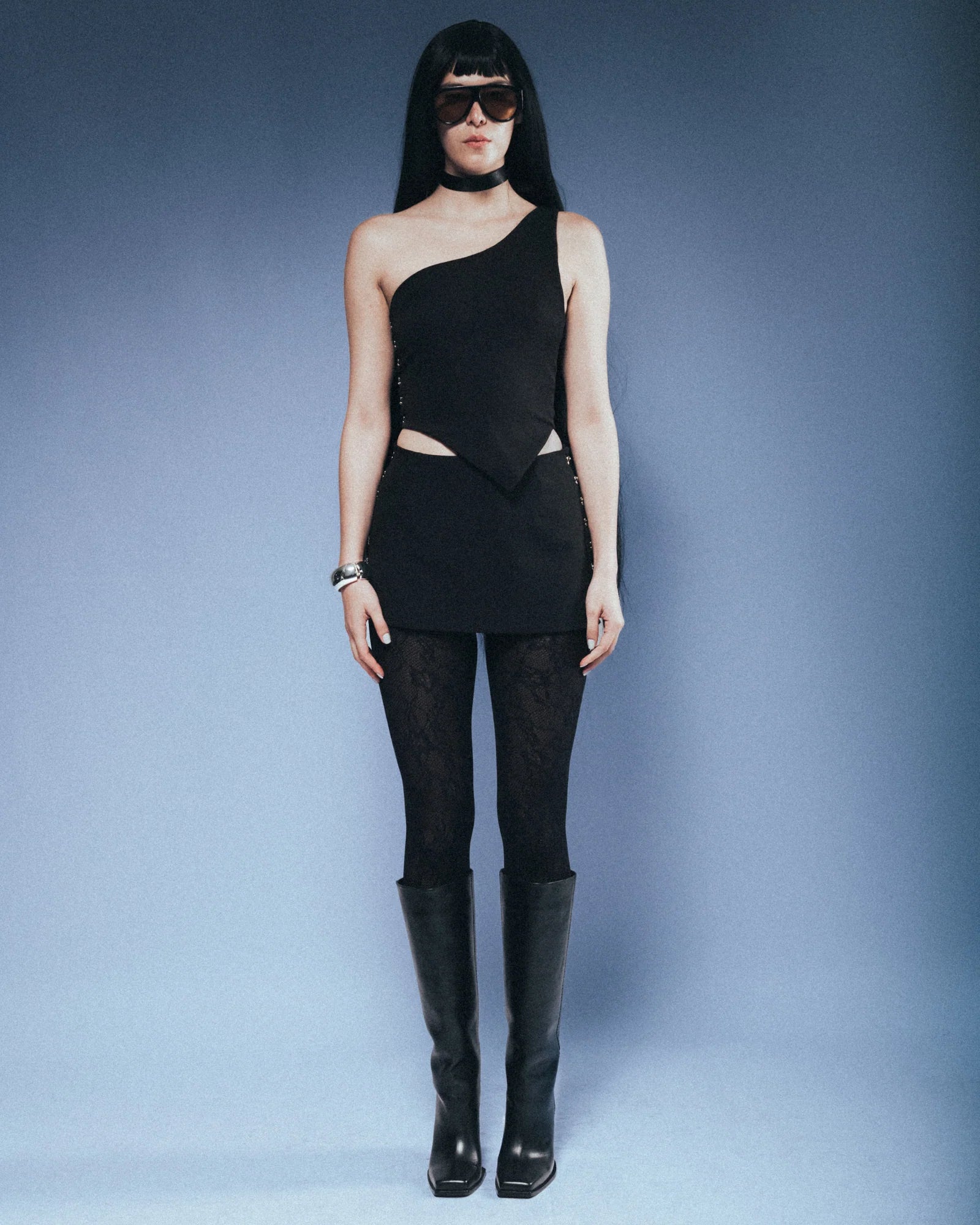 Sofisticación asimétrica con un edge inesperado. Su diseño de un hombro entorchado y broches en el costado crean una silueta minimalista pero arriesgada. Un statement piece para quienes desafían lo convencional.