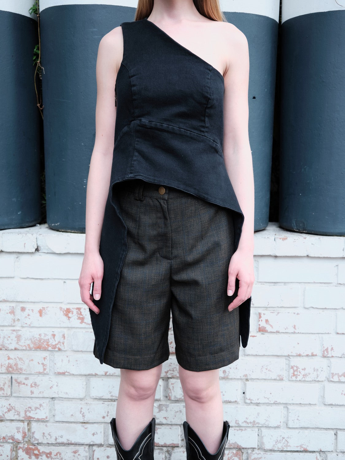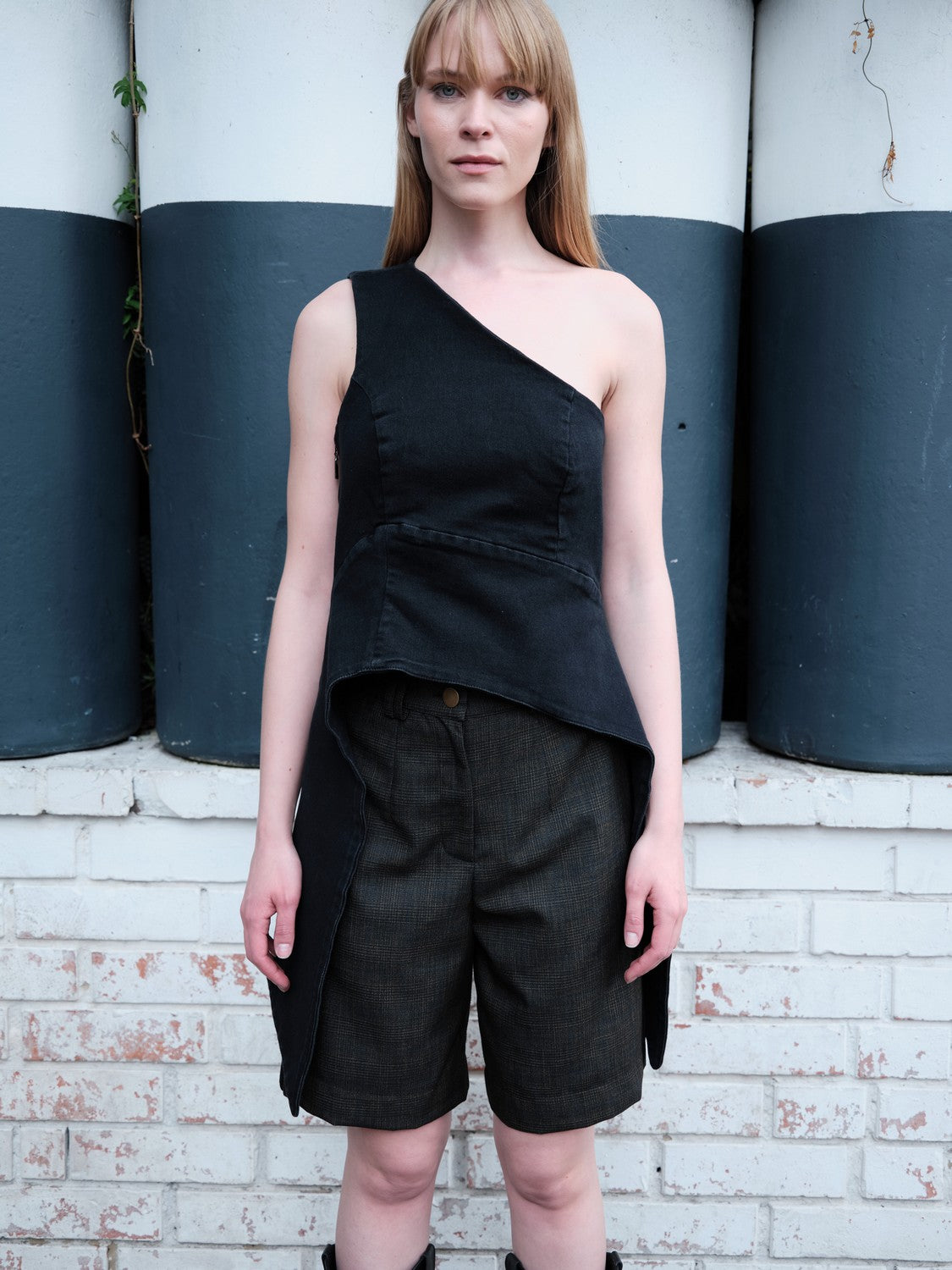 Top con diseño de un solo hombro, con escote diagonal que rompe la simetría tradicional, aportando un aire moderno y minimalista. La parte frontal es corta y curva, mientras que los laterales se extienden hacia abajo, creando una silueta dramática que alarga visualmente la figura.