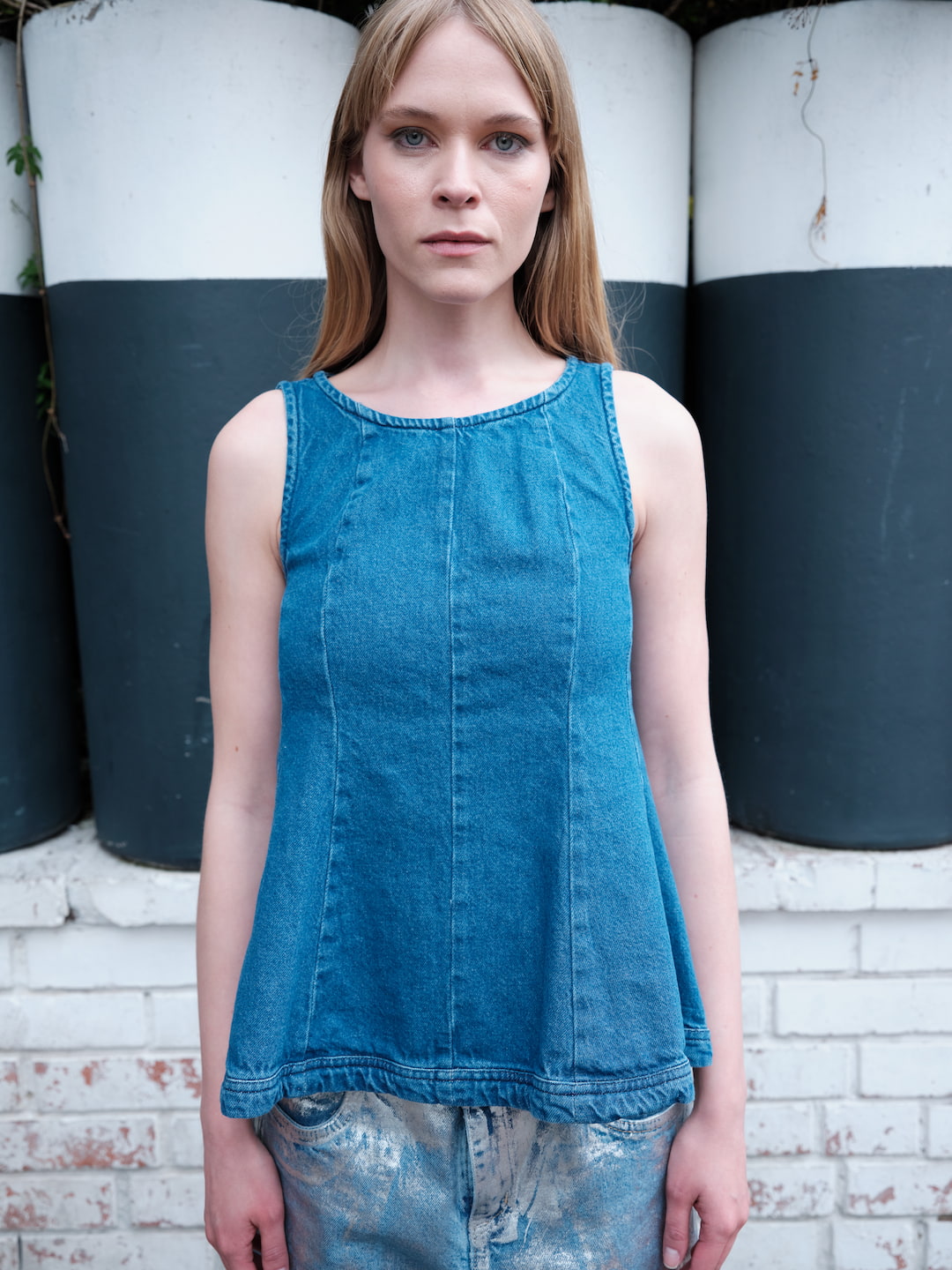 Se trata de un top sin mangas con silueta en forma de A (peplum sutil), que favorece la libertad de movimiento. Las costuras verticales visibles no solo son decorativas; ayudan a dar forma al torso y crean un efecto visual de alargamiento.