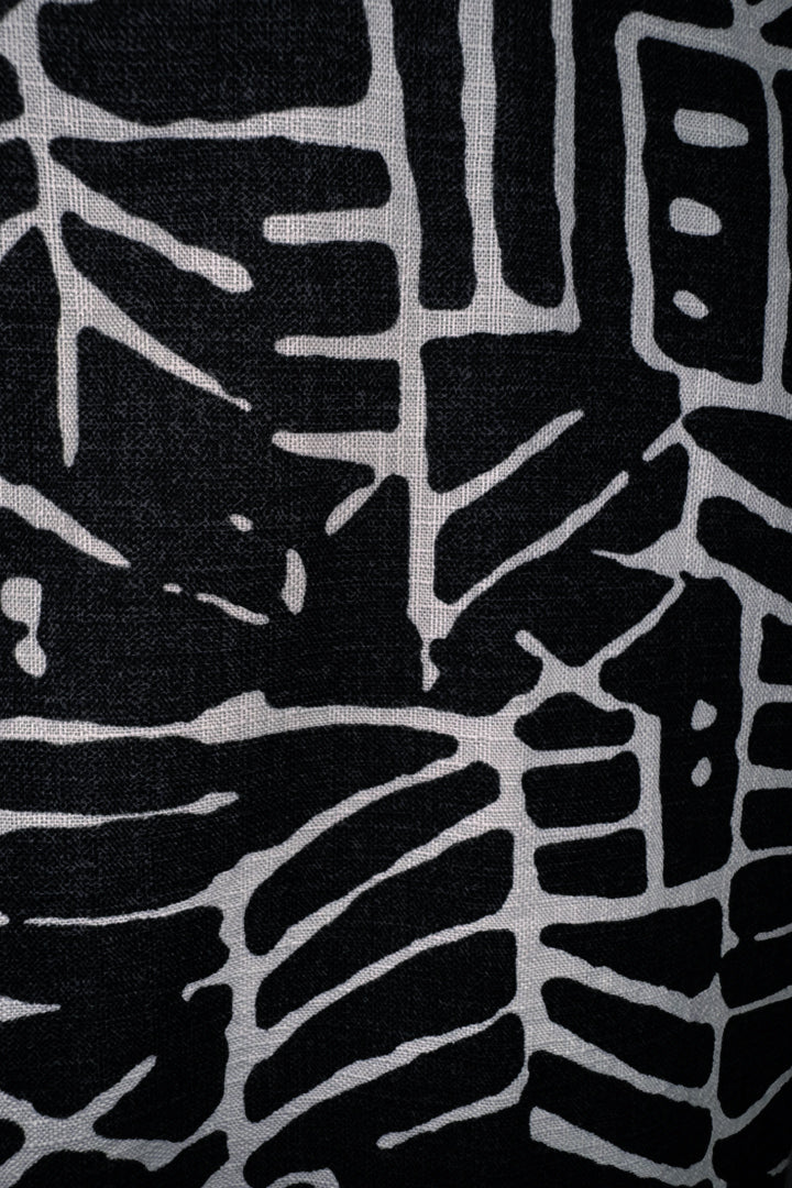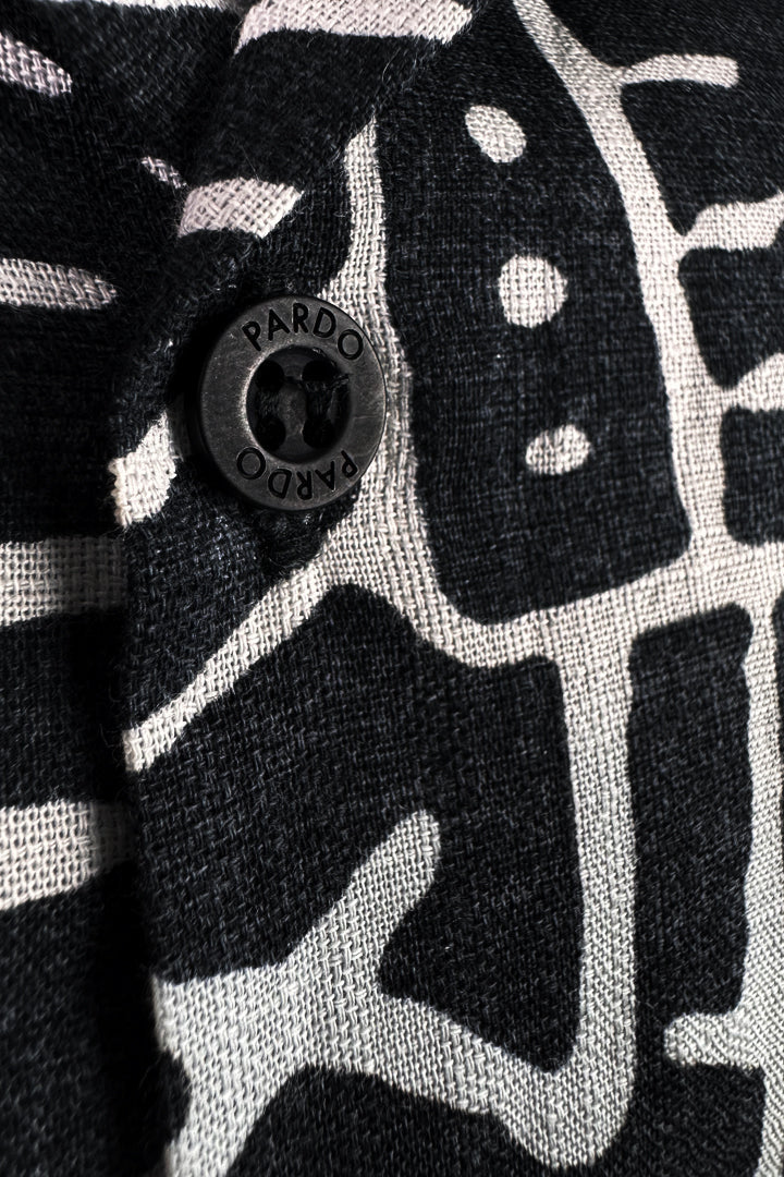 Camisa manga corta tejida en algodón con estampado tipo arqueológico negro, el hilo tiene un tejido abierto que hace que la camisa sea muy fresca y cómoda. La camisa tiene cuello tipo bowling y cierre frontal de botones.