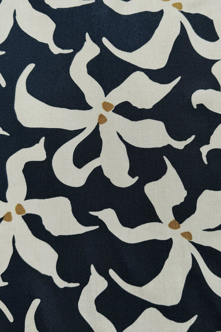 Camisa manga corta en viscosa azul con estampado botánico con flores blancas y centro ocre, esta camisa tiene bolsillo en la parte izquierda del pecho.