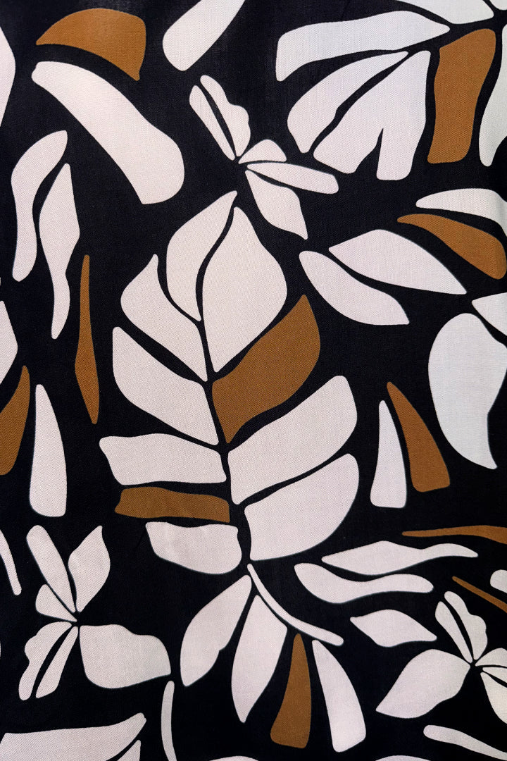 Camisa manga corta en viscosa negra con estampado de follaje blanco y café, esta camisa tiene bolsillo en la parte izquierda del pecho.