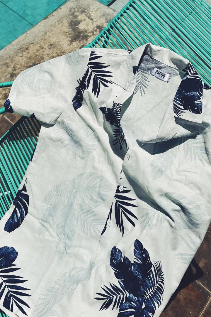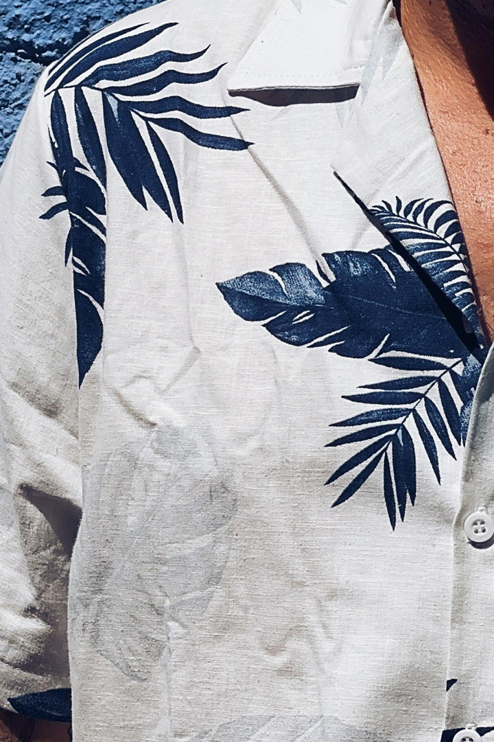 Camisa manga corta tejida en algodón con estampado de ramas azul oscuro y otras en azul muy claro, la prenda tiene un tejido abierto que hace que la camisa sea muy fresca y cómoda. Cuello tipo bowling y cierre frontal de botones.