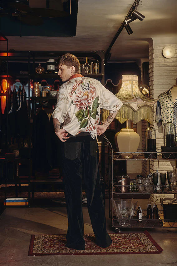 Esta camisa es una declaración etérea sobre el amor, la resiliencia y los contrastes sagrados. Confeccionada en seda vegana fluida, su base en tono marfil jaspeado sirve de escenario para un vívido juego de imágenes y simbolismos. Boxy fit. Cinco botones cubiertos.
