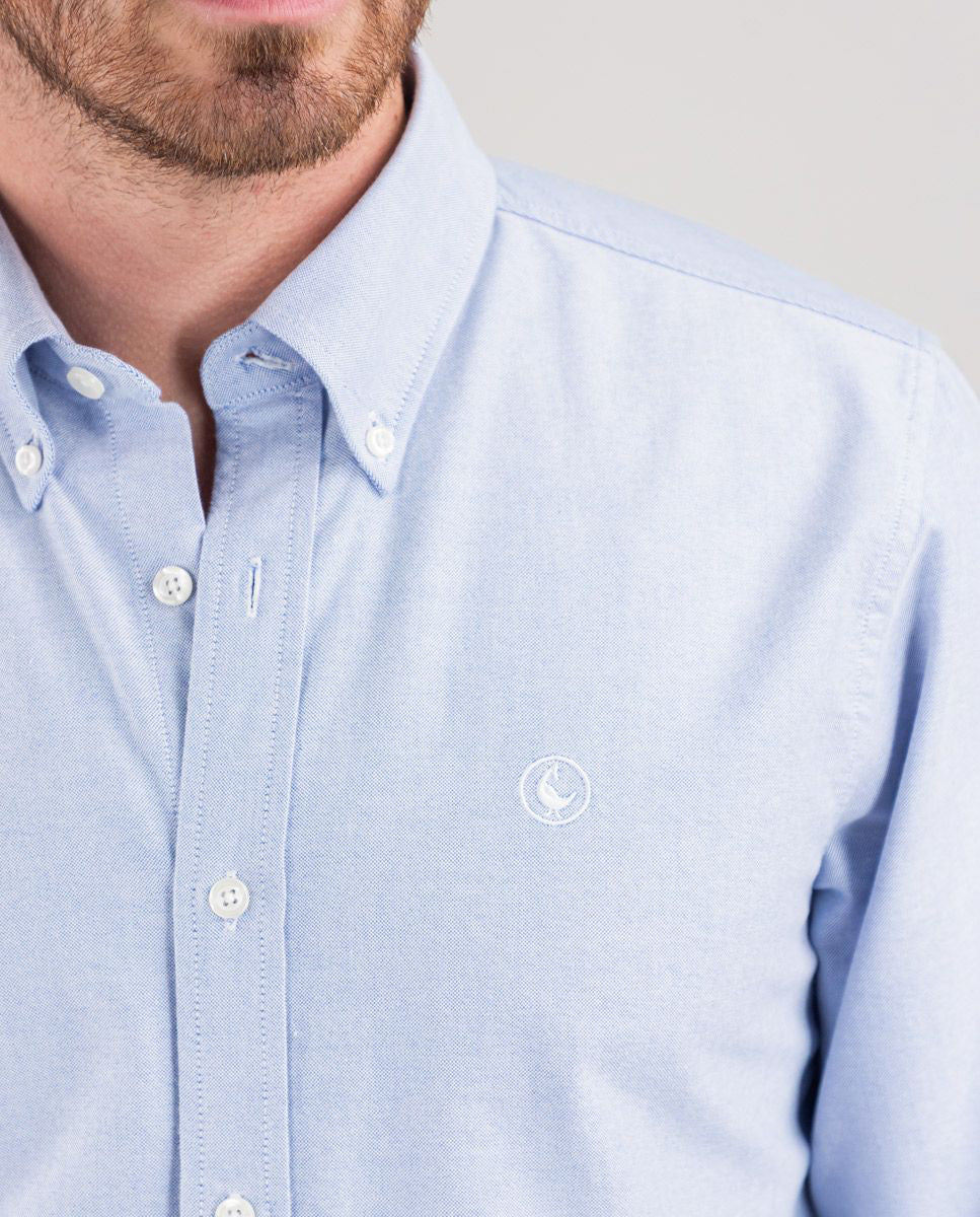 Camisa de hombre oxford lisa con tejido compuesto de 93% algodón y 7% algodón reciclado. Corte Regular Fit, cuello buttondown y cierre con botones. Manga larga terminada en puño simple y logo en el pecho bordado. Detalles interiores a contraste de cinta corbatera.