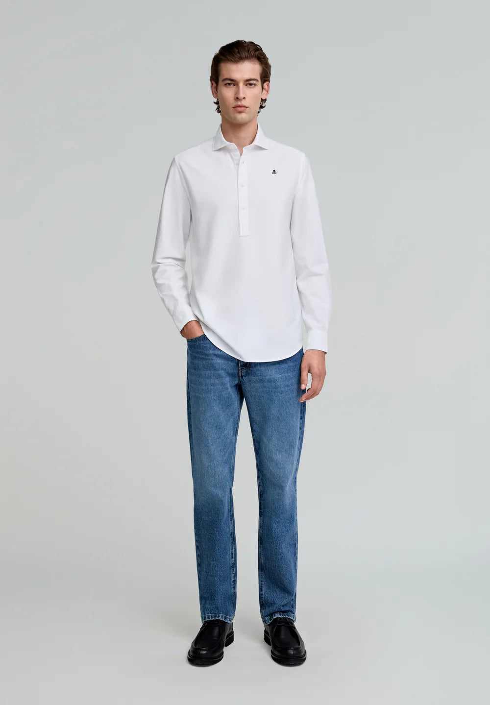 Camisa estilo polera confeccionada en tejido de algodón. Presenta corte regular fit, cuello siena y cierre con botones. Con mangas largas terminadas en puño simple. Presenta como detalle la calavera a contraste.