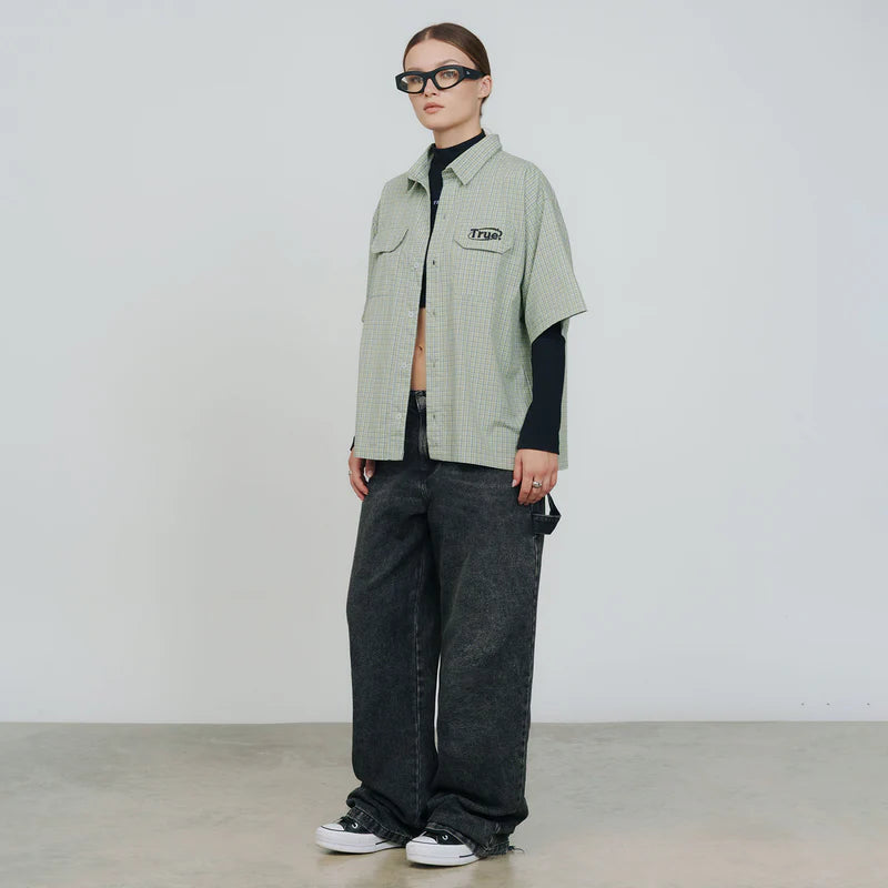 Camisa manga corta verde olivo, hecha en algodón con silueta boxy. Tiene un bolsillo frontal a un lado con el logo bordado en la tapa.