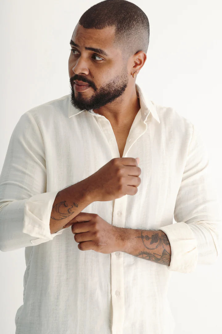 Camisa manga larga en algodón beige con rayas en tejido abierto simulando una malla. La textura de la tela asemeja al lino lo cual hace que esta camisa sea muy fresca.