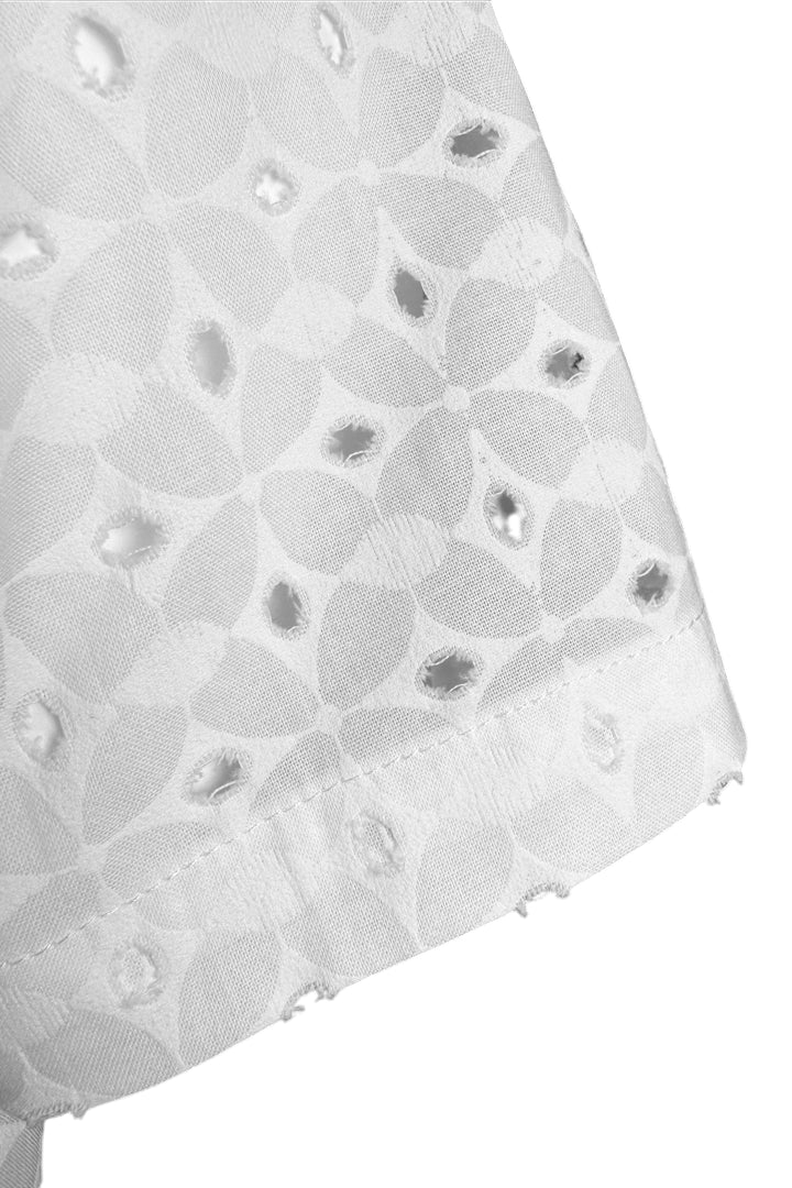 Camisa manga corta en algodón blanco (ojalillo) con estampado estilo retro y troquelado dentro del estampado, entretela en botonera y cuello, tiene bolsillo en la parte izquierda del pecho.