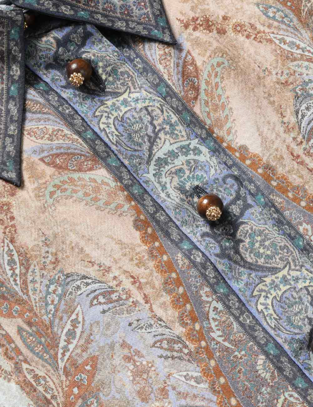 Camisa de manga corta Wanderlust en azul tapiz multicolor de nuestra colección Resort Swim 2026. Una camisa de seda con cuello clásico, botones en el centro delantero, puños enrollados y bajo asimétrico.