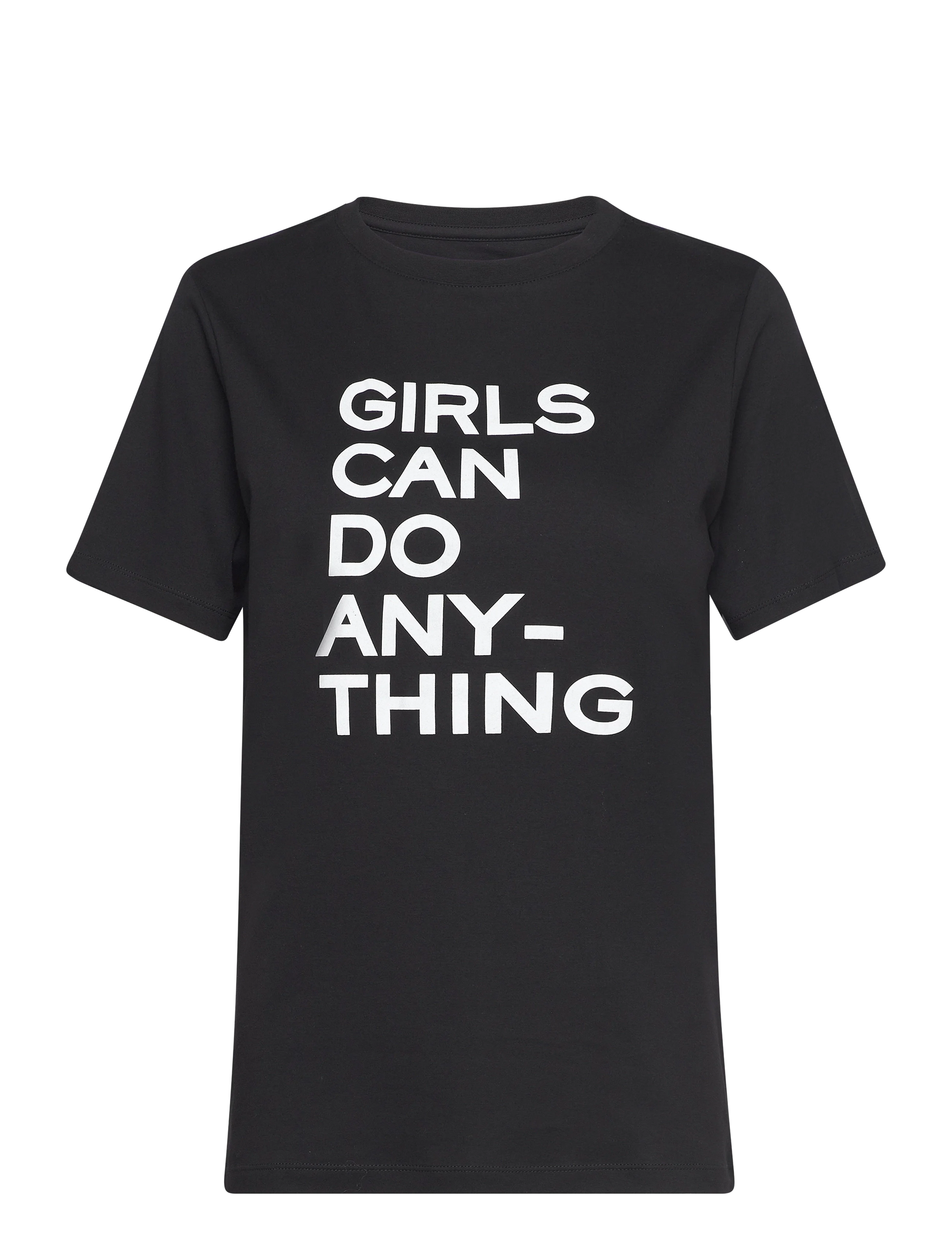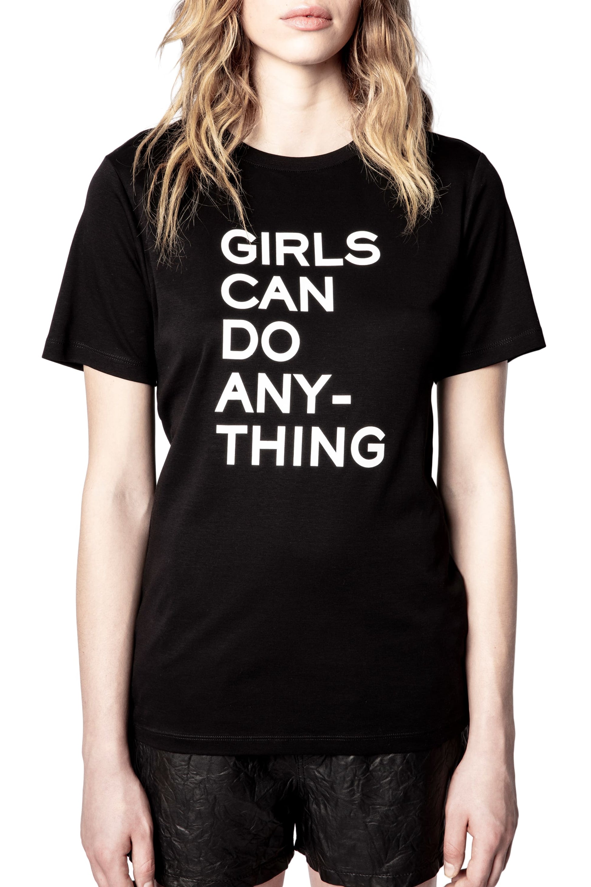Camiseta de algodón para mujer con el mensaje «Girls can do anything» engastado con strass